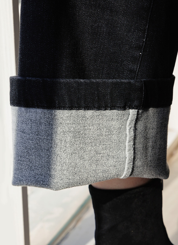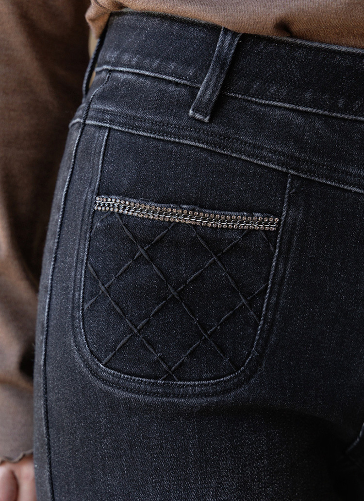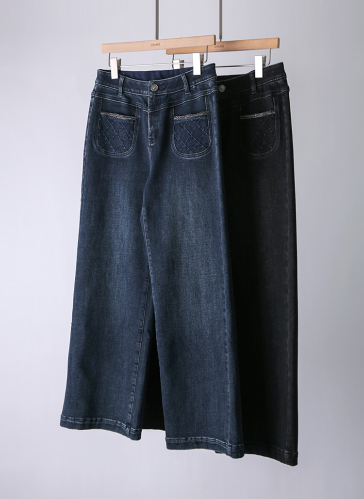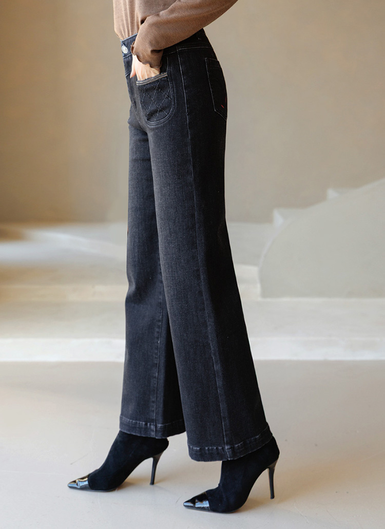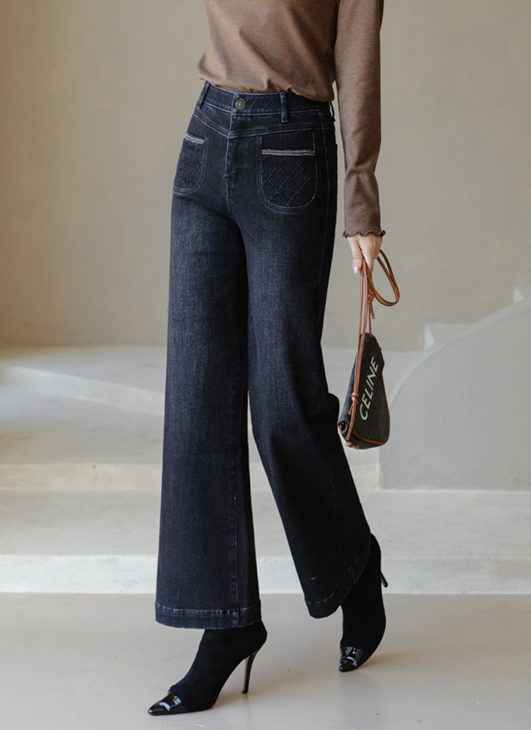 [Winter-ready straight wide jeans with soft brushed lining, elastic waist band and stretch denim. Diamond quilted pockets with subtle bead accents elevate casual looks with warmth and comfort.]