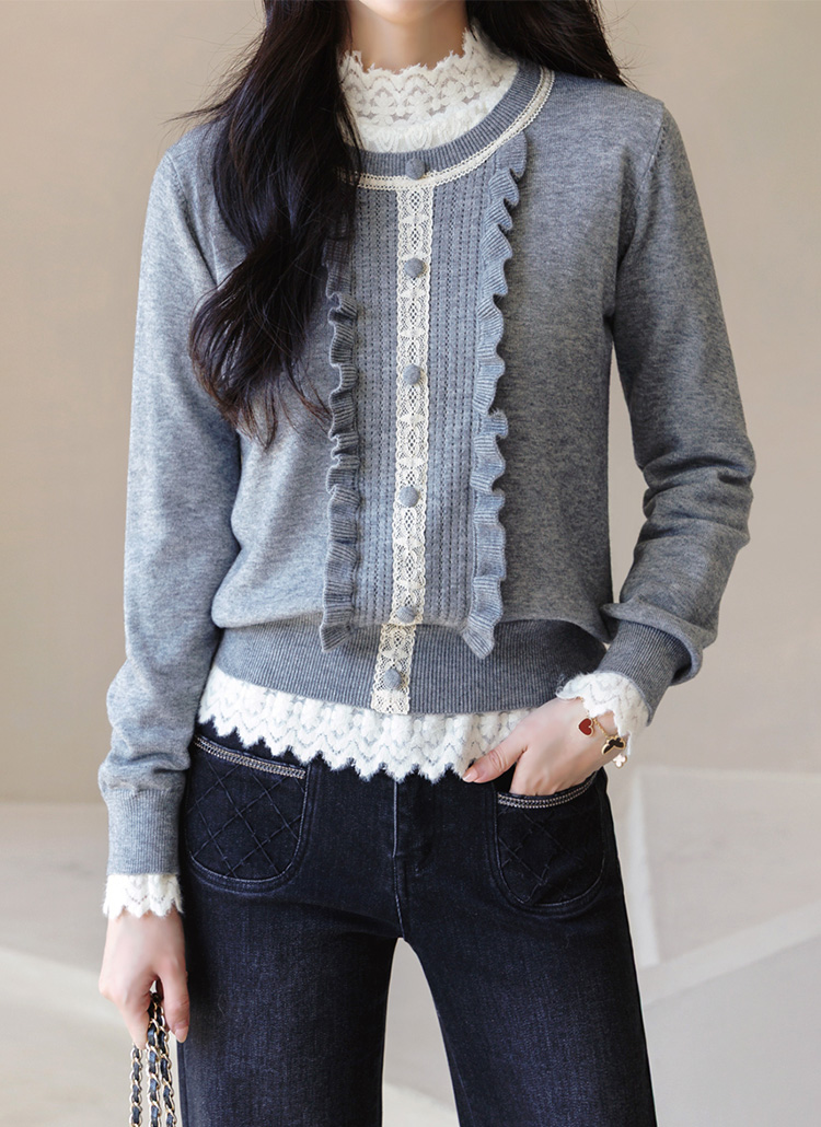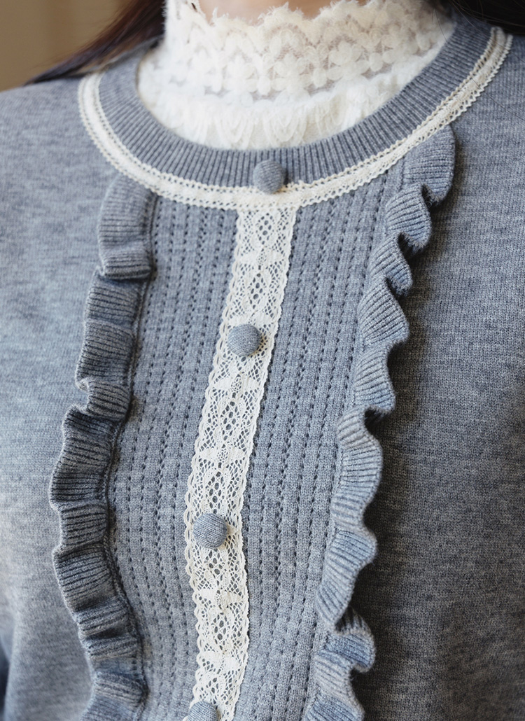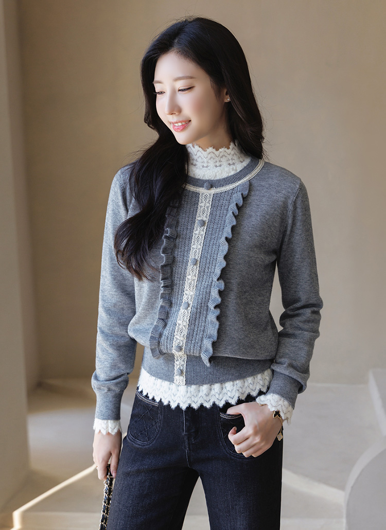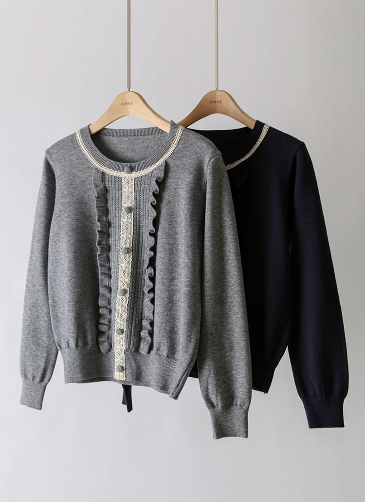 [Soft knit texture wraps the body comfortably, finished with lace detailing and petite buttons. Balanced frill lines add charm without excess, ideal for everyday wear.]