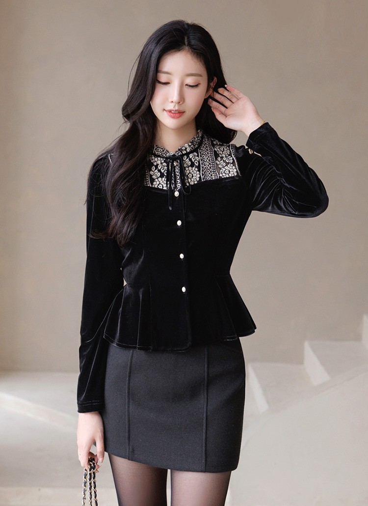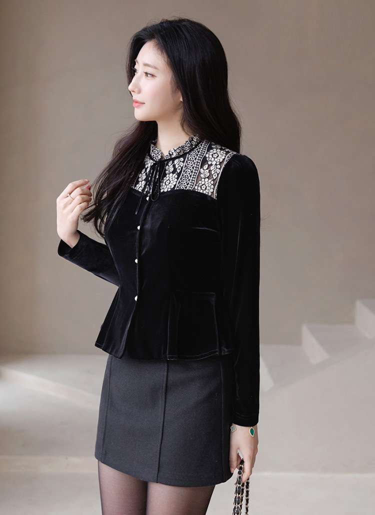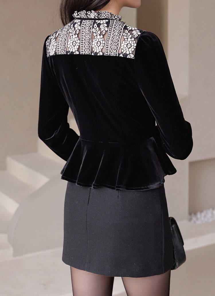 [LouisAngel] Lace Contrast Velour Peplum Blouse