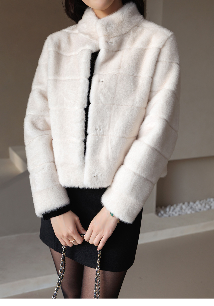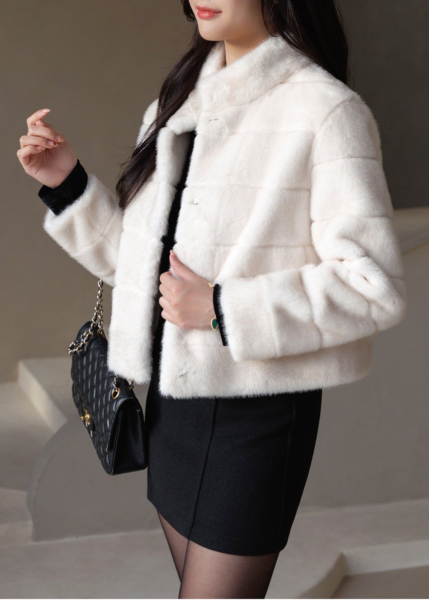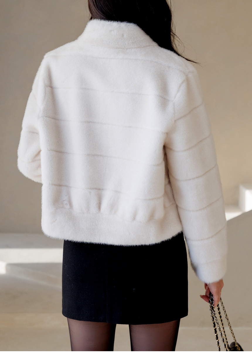 [Luxuriously soft faux fur with a creamy touch and elegant tiered layers, finished in a semi-cropped fit that elevates winter outfits with warmth and polish.]