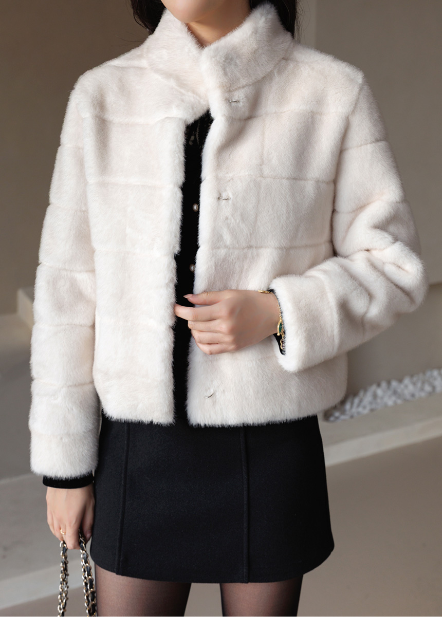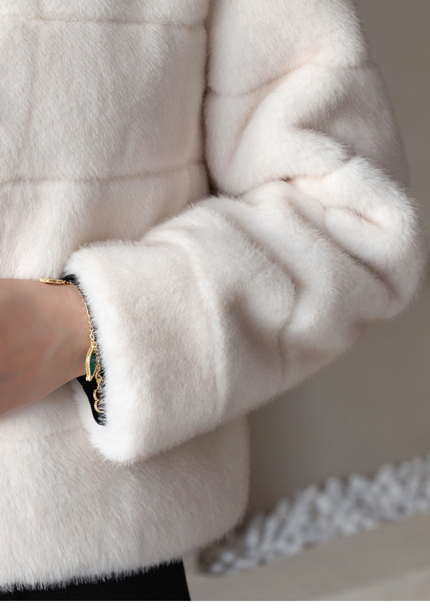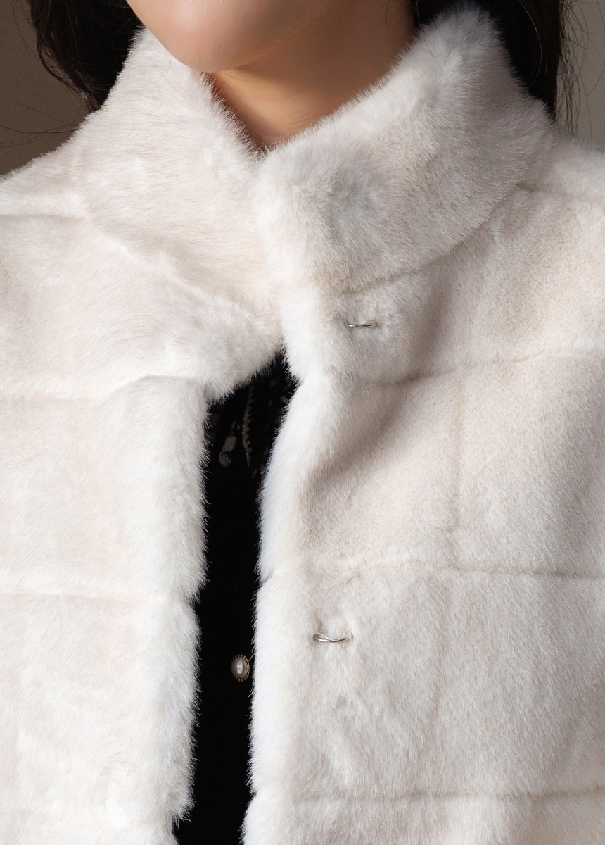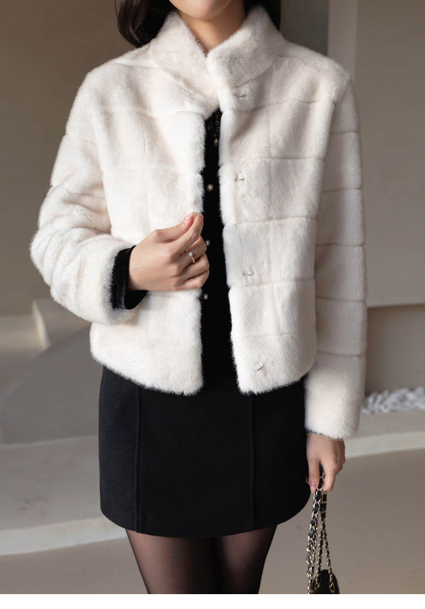 [Luxuriously soft faux fur with a creamy touch and elegant tiered layers, finished in a semi-cropped fit that elevates winter outfits with warmth and polish.]