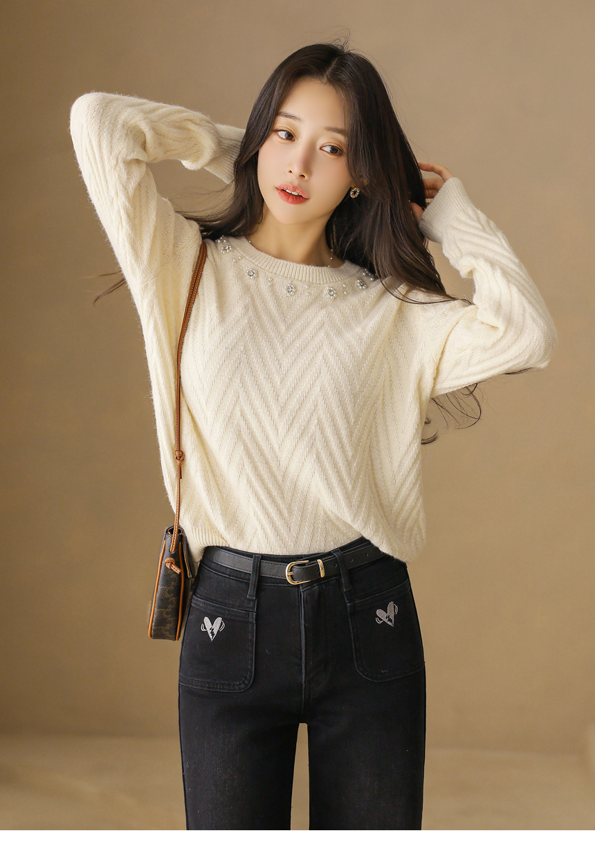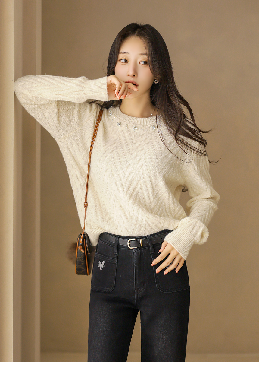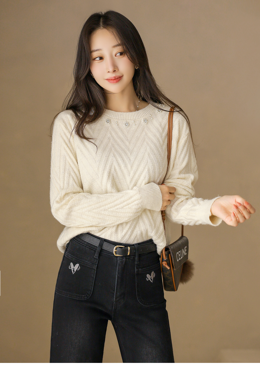 [An elegant chevron-textured knit with sparkling floral crystal accents along the neckline, offering cozy warmth, soft stretch, and a refined everyday look.]