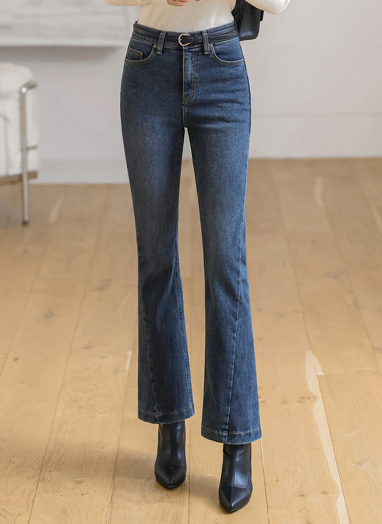 [A slim bootcut denim with diagonal seam details and soft fleece lining, designed to lengthen the legs while offering stretch comfort and cozy warmth for winter wear.]