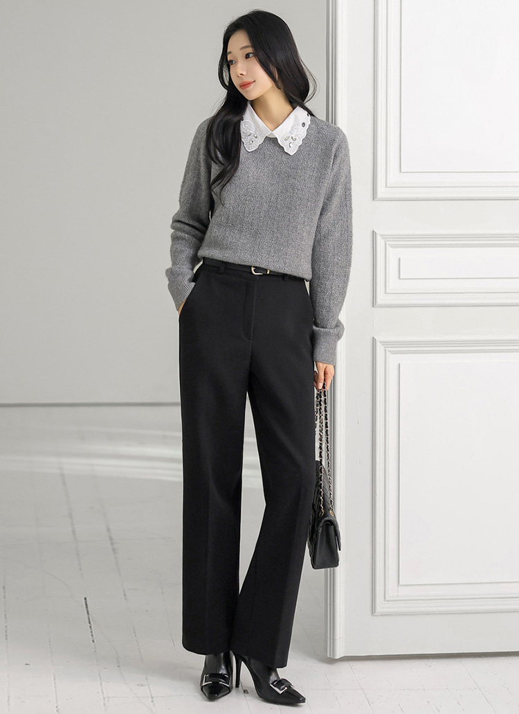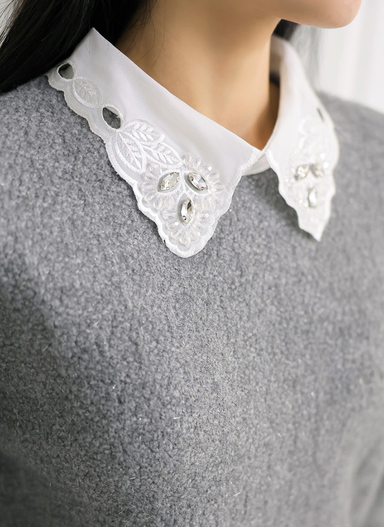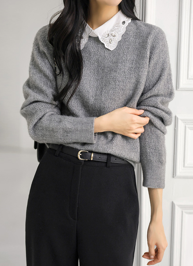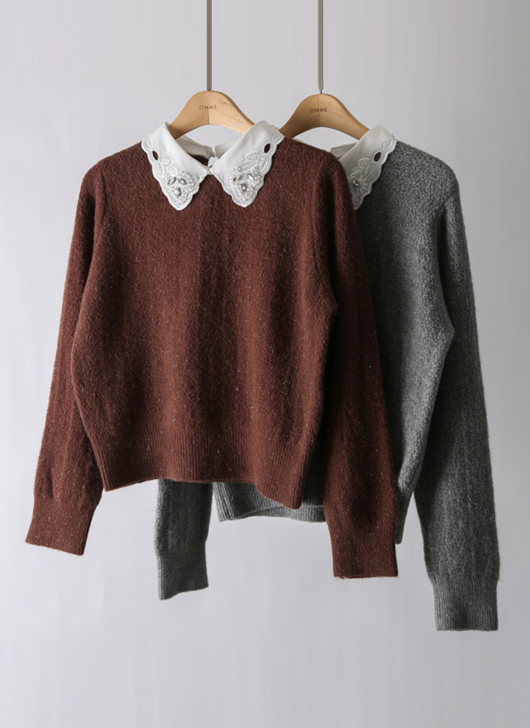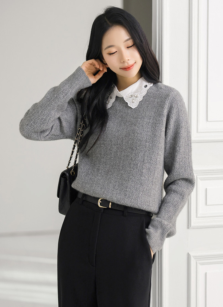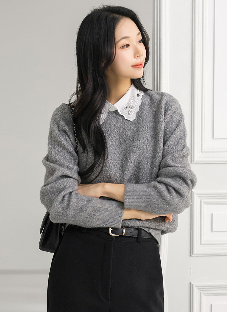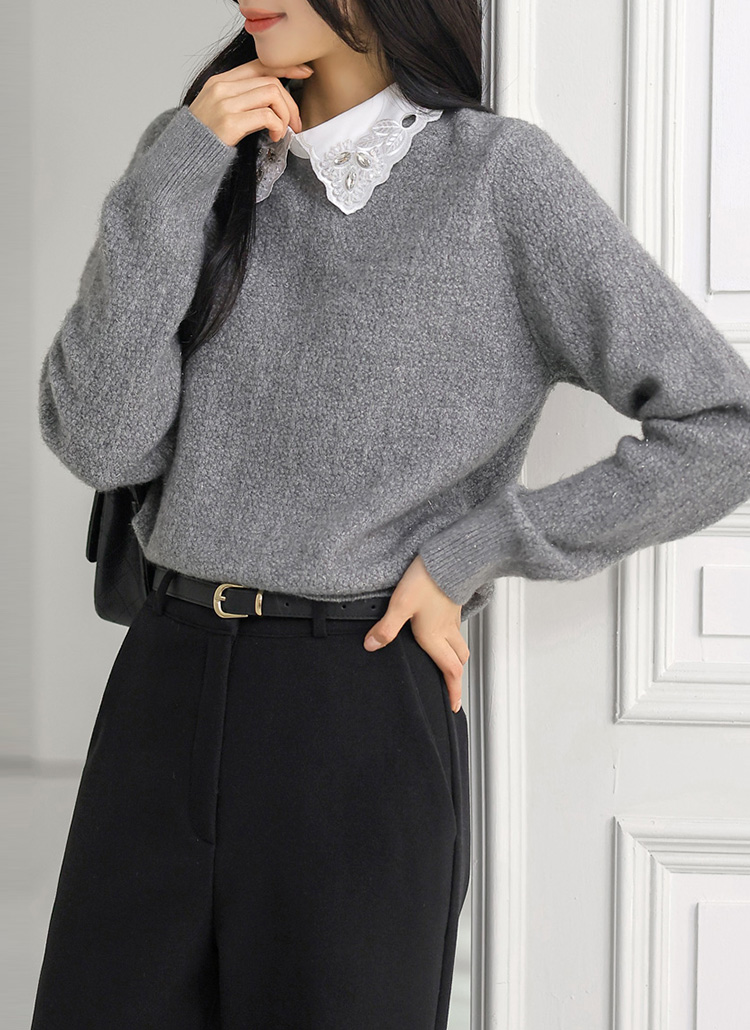 [A softly shimmering knit sweater with a crystal-accent lace collar, offering cozy warmth, a clean fit, and elegant femininity for daily wear, office looks, or refined winter layering.]
