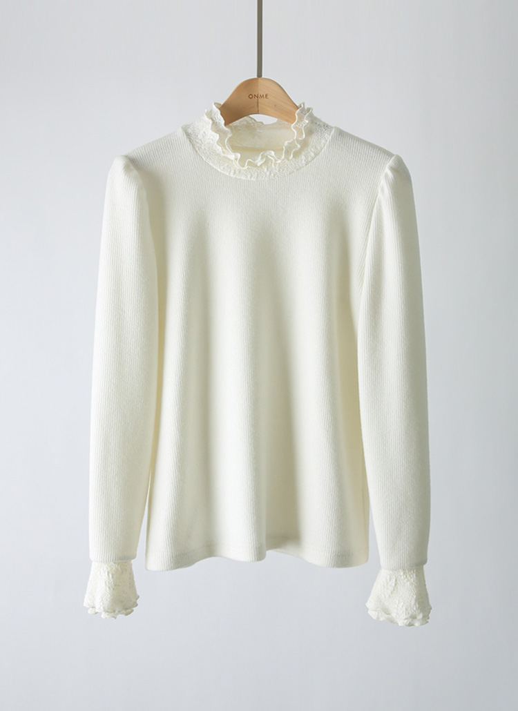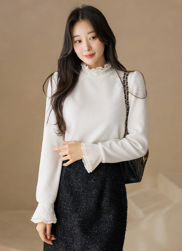 [A refined ribbed blouse tee with layered jacquard lace frills at the neckline and cuffs, offering soft warmth, gentle stretch, and elegant styling for fall and winter outfits.]