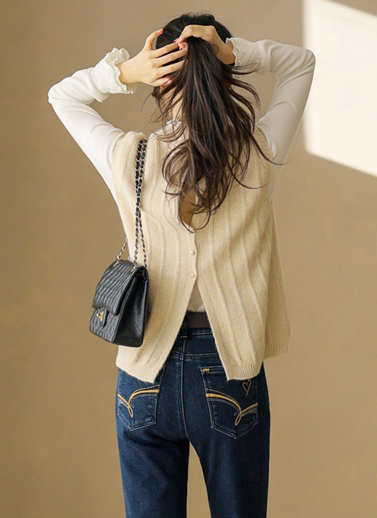 [A clean rib-knit vest with a subtle back slit and button detail, offering cozy hairline texture, easy layering, and a refined silhouette for modern everyday styling.]