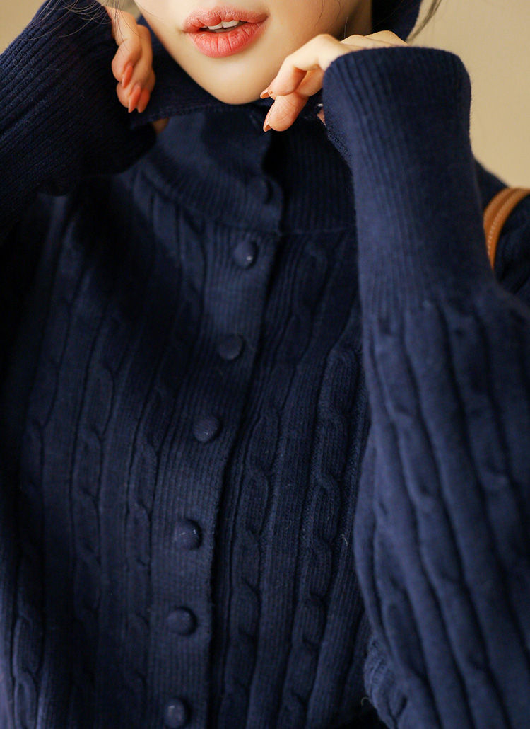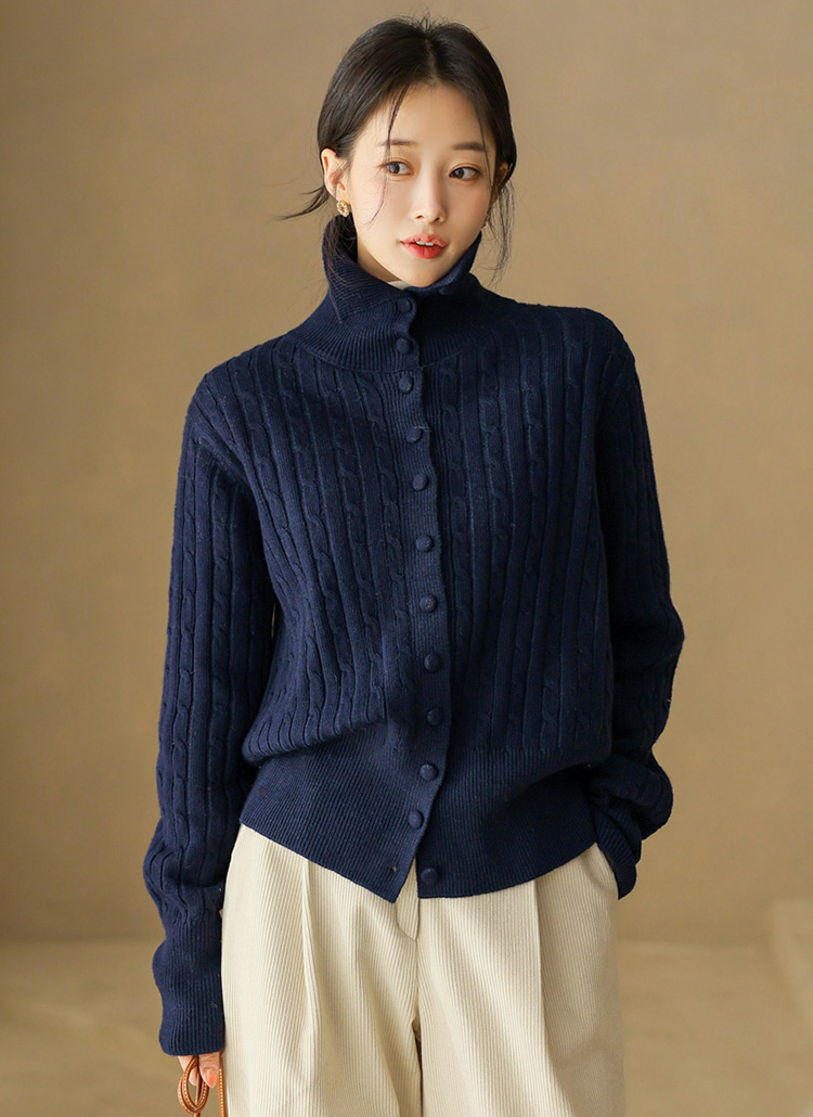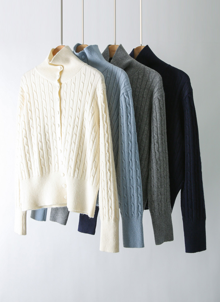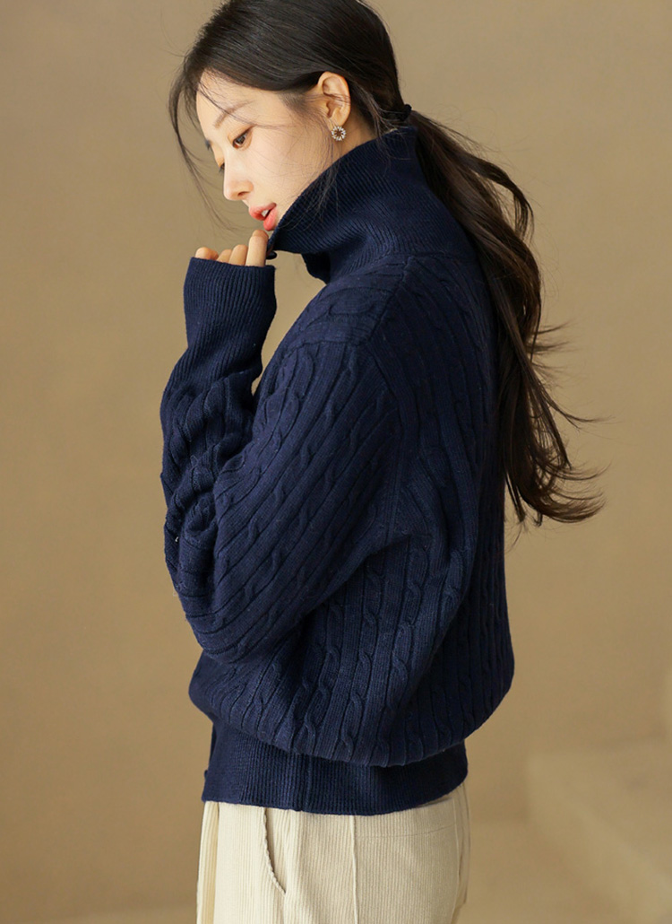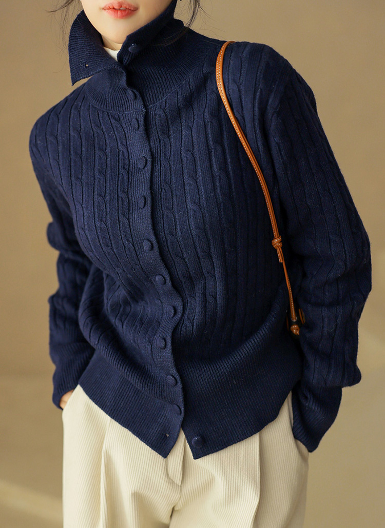 [A refined cable-knit cardigan with a soft turtleneck and slim ribbed hem, offering cozy warmth and a polished silhouette perfect for daily wear, work looks, or smart layering.]