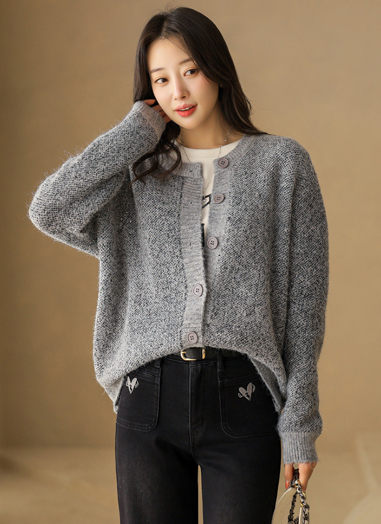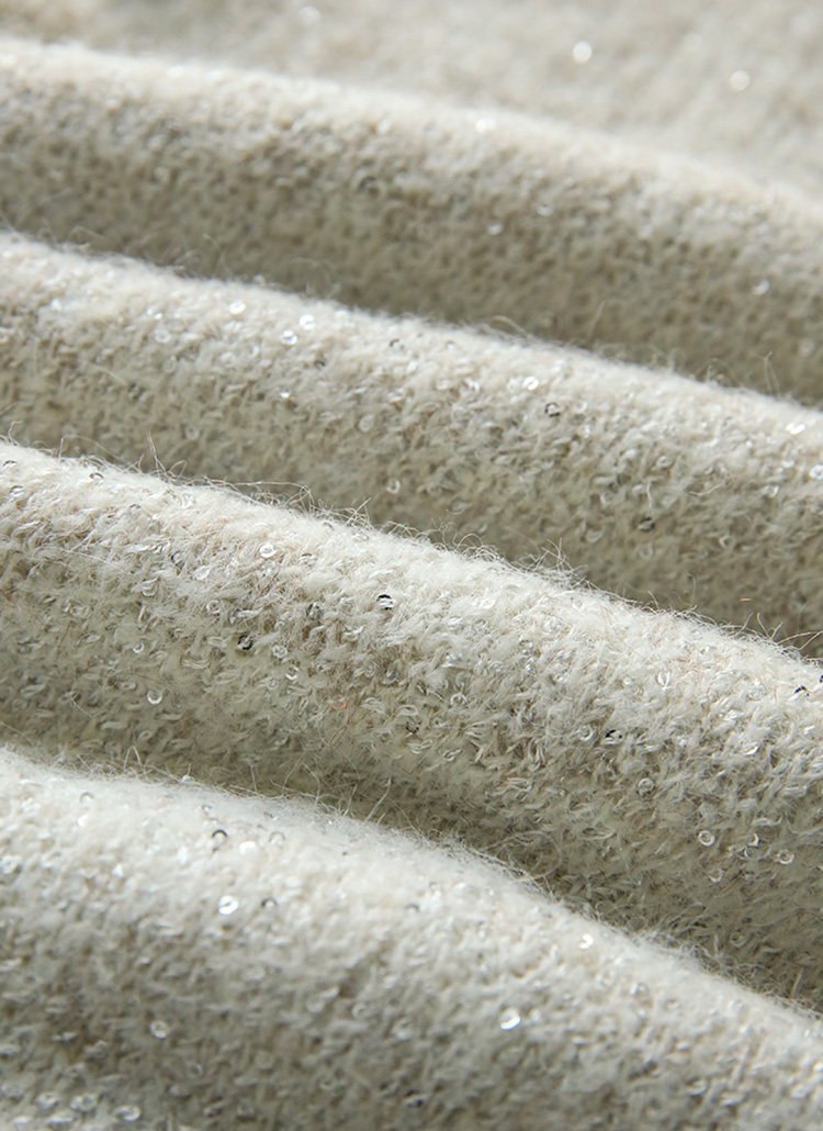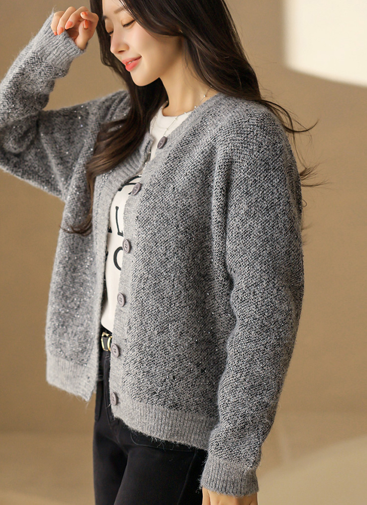 [Subtle sequins and metallic-blend yarn add a refined glow to this cozy bouclé knit cardigan, finished with a relaxed fit and gentle stretch for effortless daily layering.]