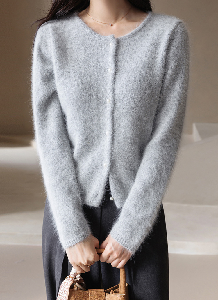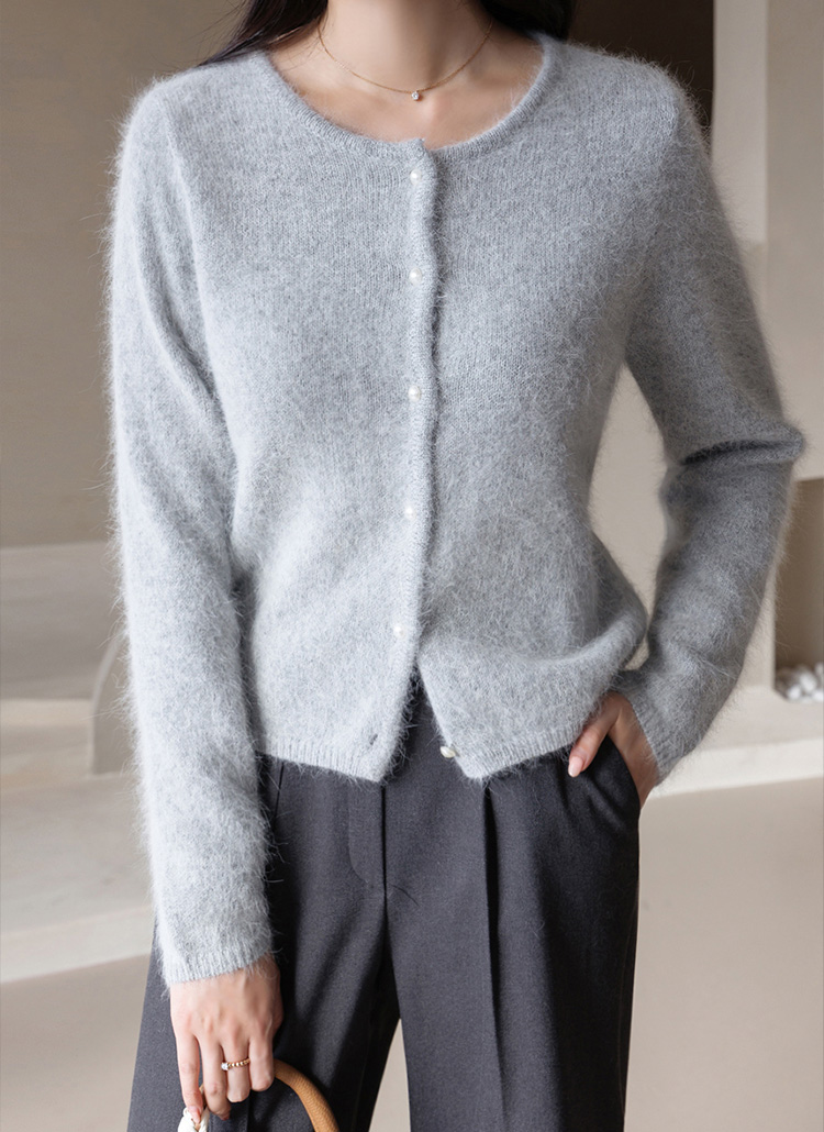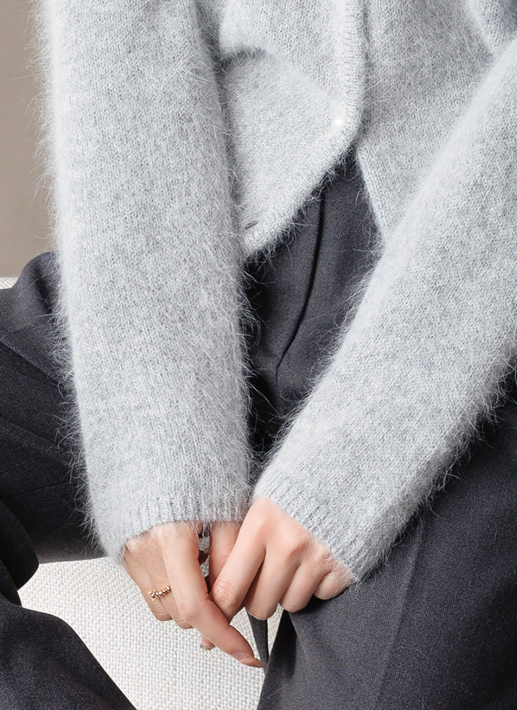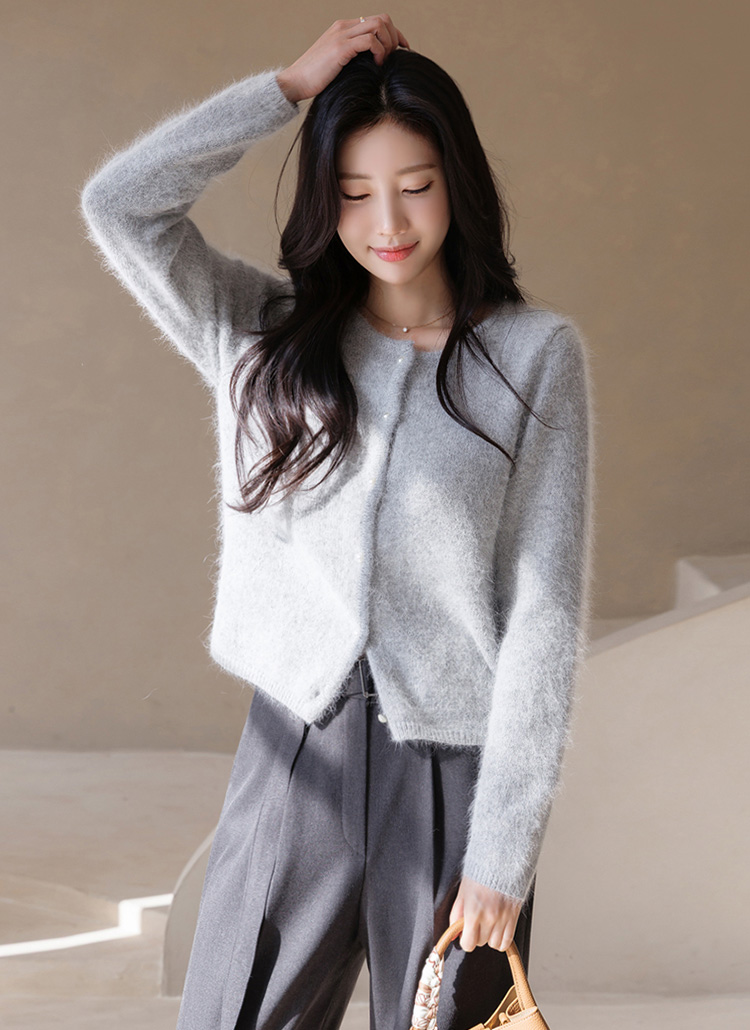[A romantic angora-blend cardigan featuring a plush handfeel and delicate pearl buttons. Designed with a refined semi-crop silhouette for elegant everyday styling in cooler seasons.]