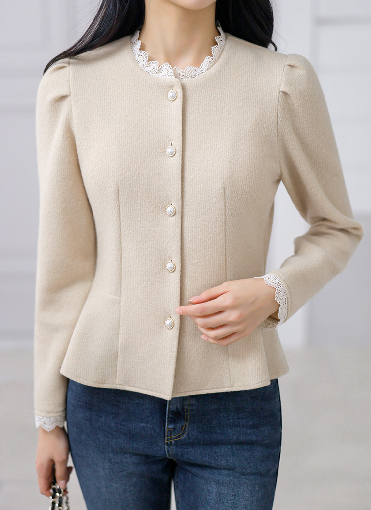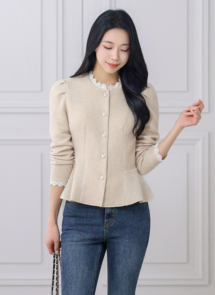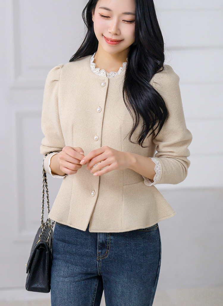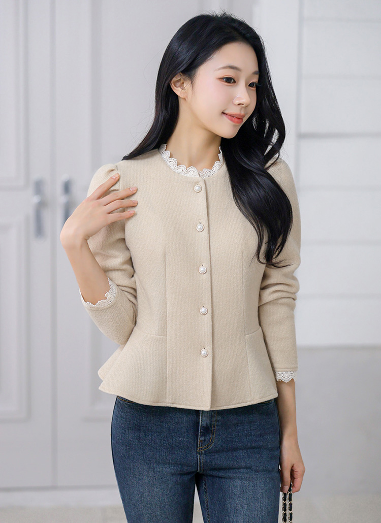 [A cozy peplum blouse with a knit-like texture, pearl buttons, and lace trim. Designed to define the waist while adding romantic elegance to fall and winter outfits.]