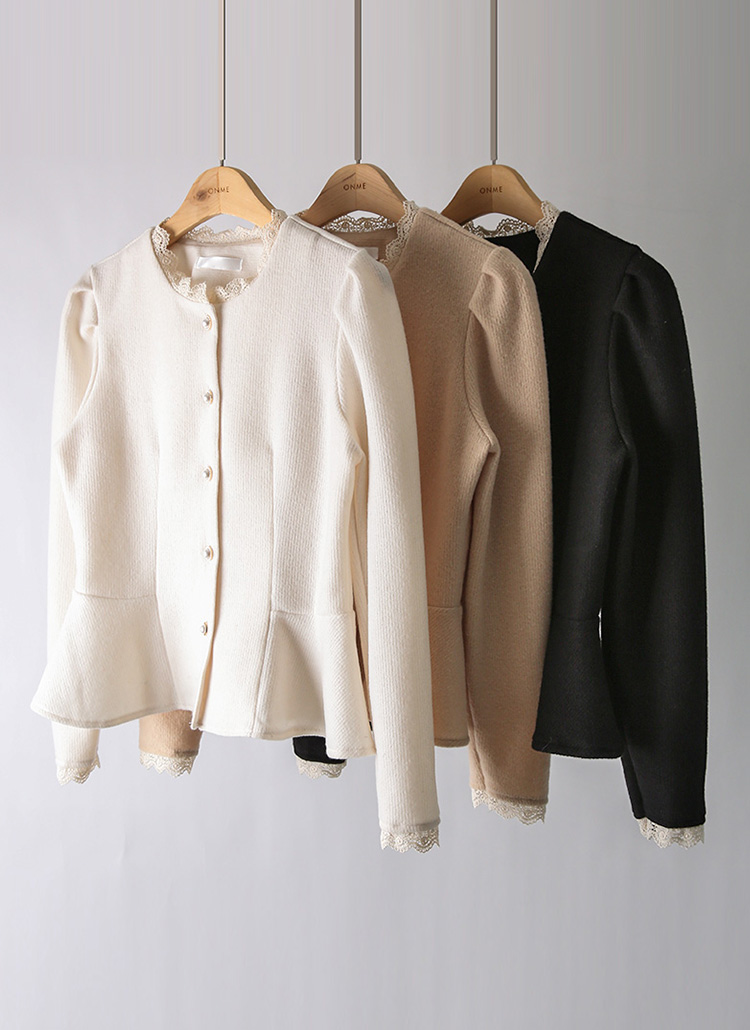[A cozy peplum blouse with a knit-like texture, pearl buttons, and lace trim. Designed to define the waist while adding romantic elegance to fall and winter outfits.]