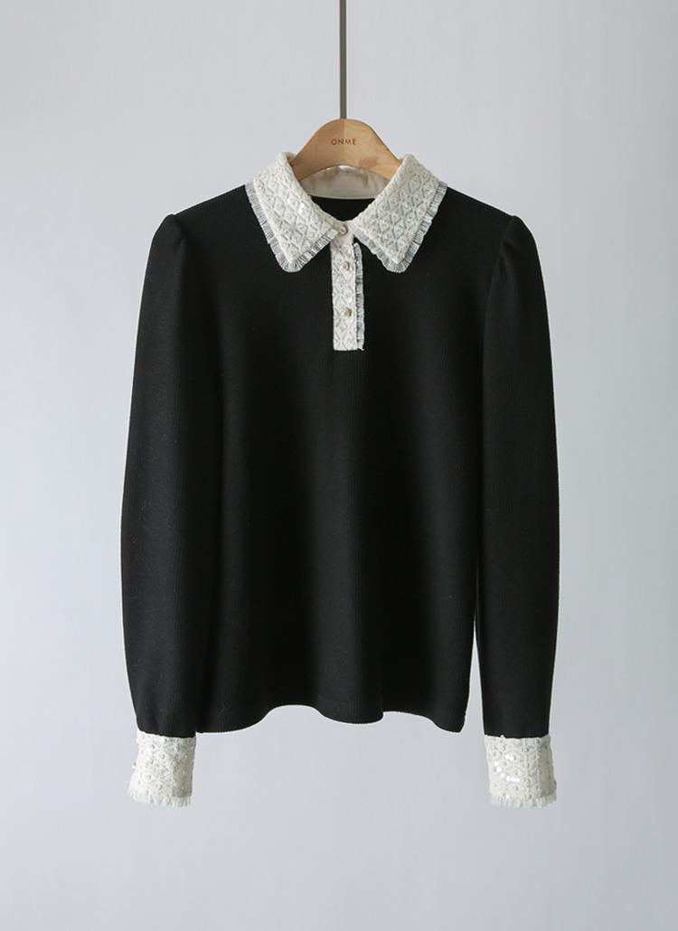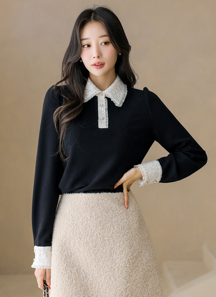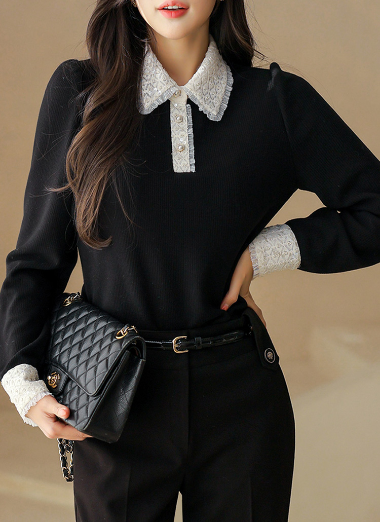 [LouisAngel] Elegant Contrast Lace Collar Ribbed Blouse Tee