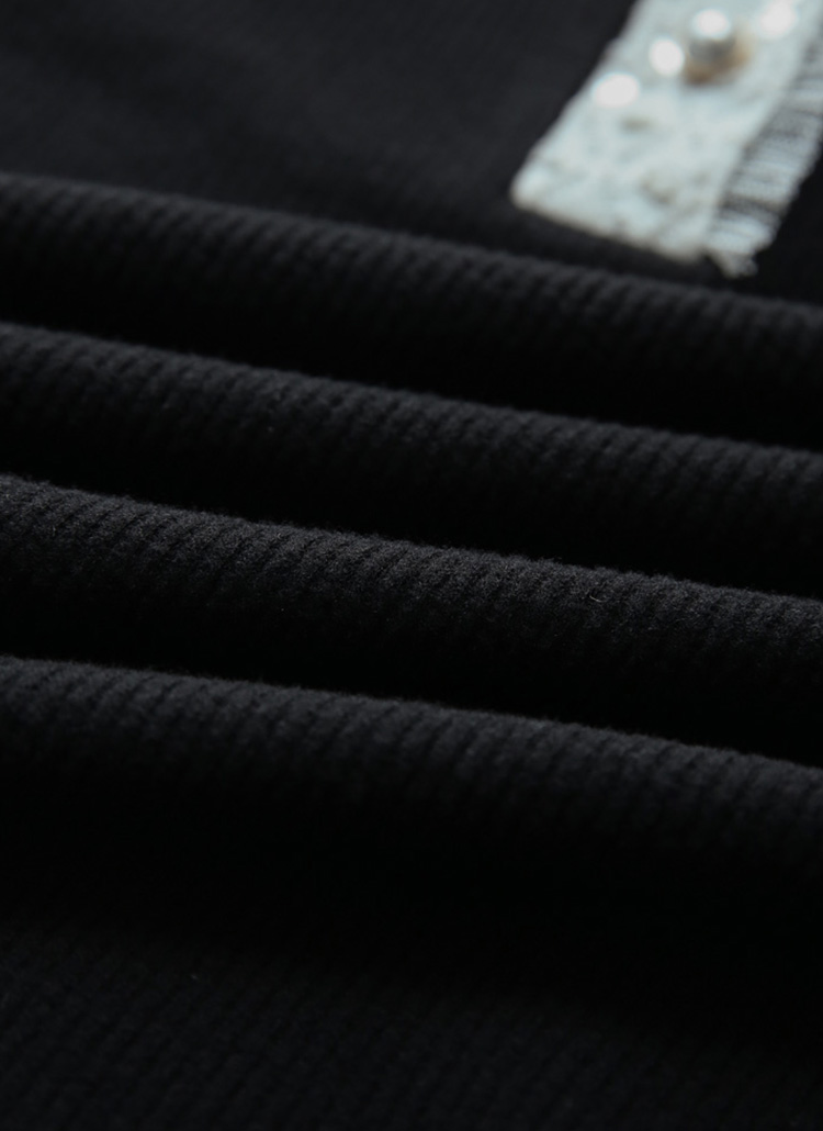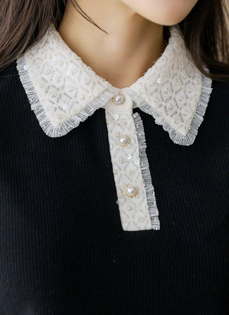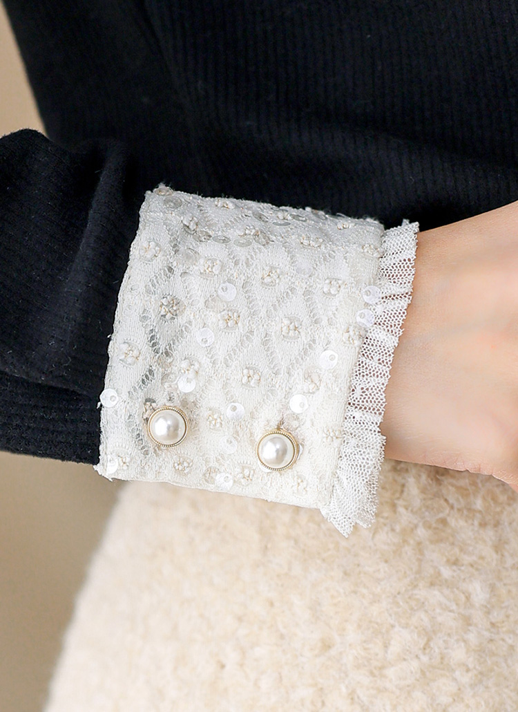 카라와 소매 끝은 스팽글이 더해진 쟈가드 레이스로 배색되어