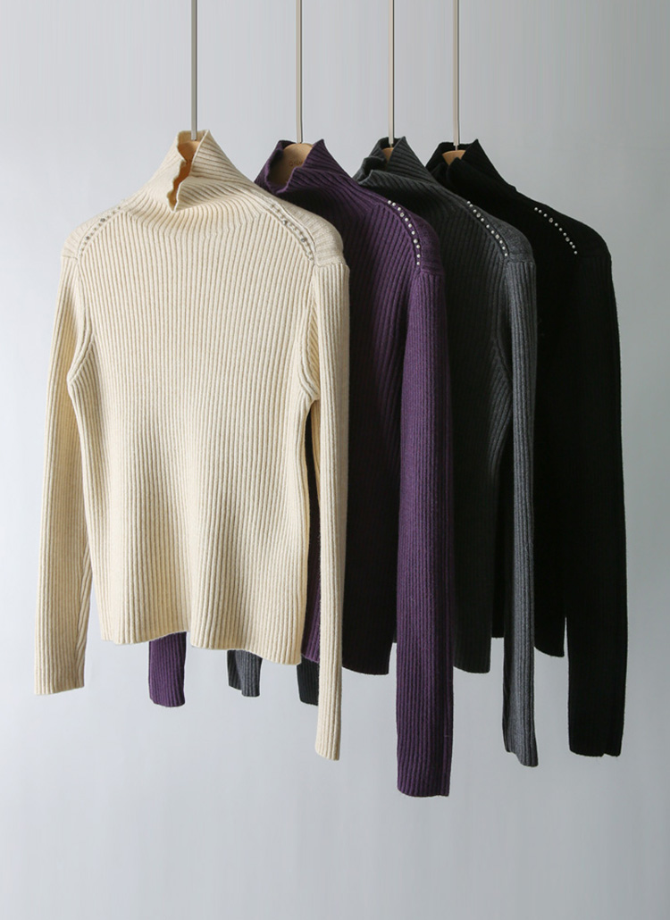 [This ribbed turtleneck features discreet pearl embellishments on the shoulder, combining smooth stretch, gentle warmth, and a feminine slim fit for versatile seasonal outfits.]