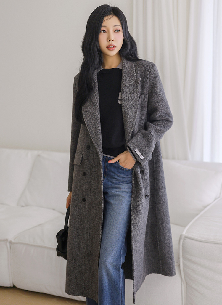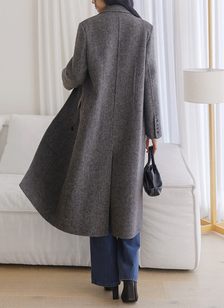 [Crafted from a rich wool-blend herringbone fabric, this long coat offers a balanced standard fit, elegant structure, and cozy warmth for polished seasonal outfits.]