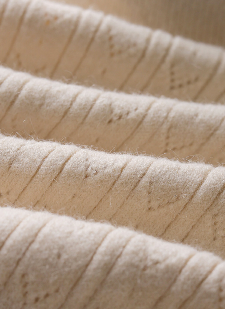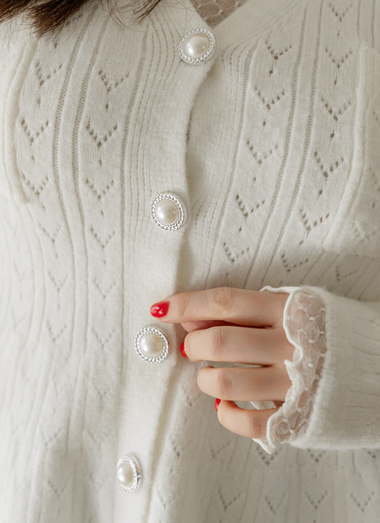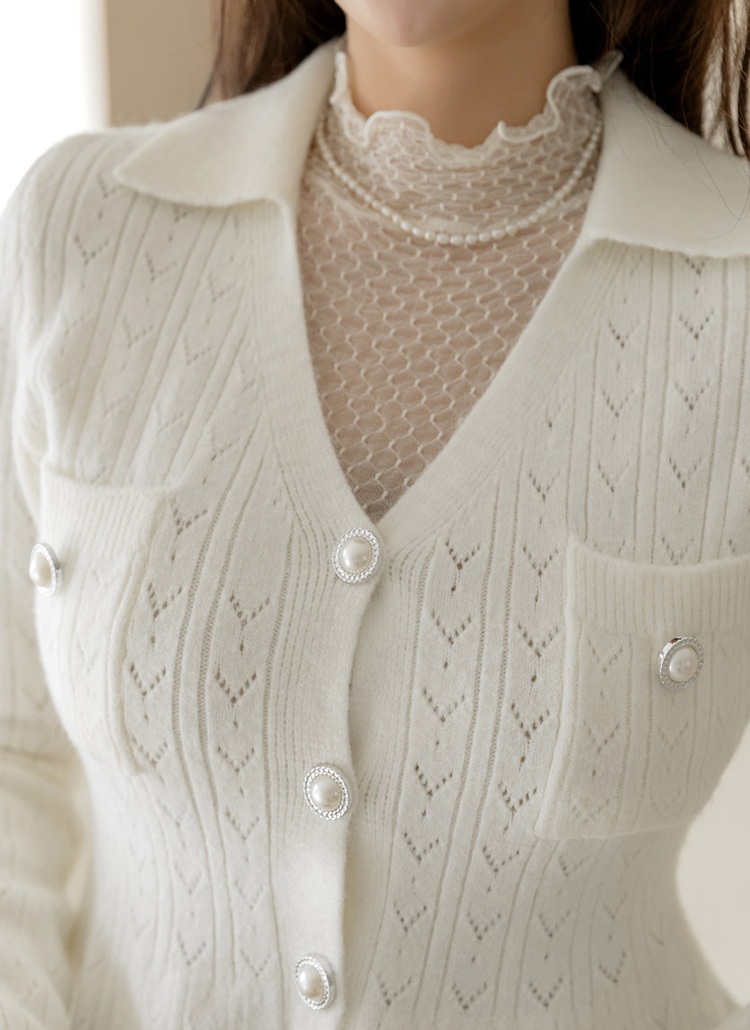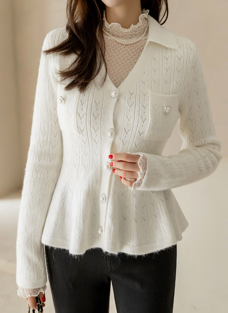 [Designed with airy openwork knit and a subtle peplum silhouette, this cardigan flatters curves beautifully while offering cozy warmth and a polished, feminine mood.]