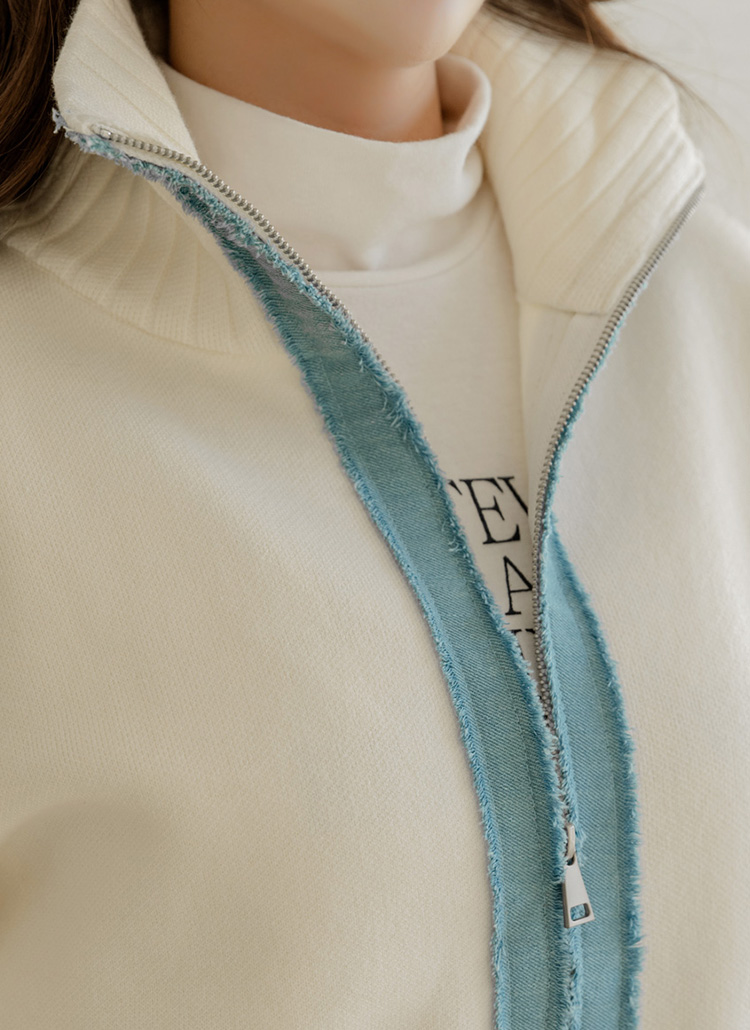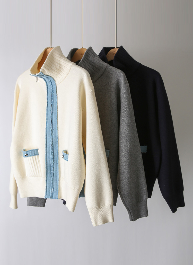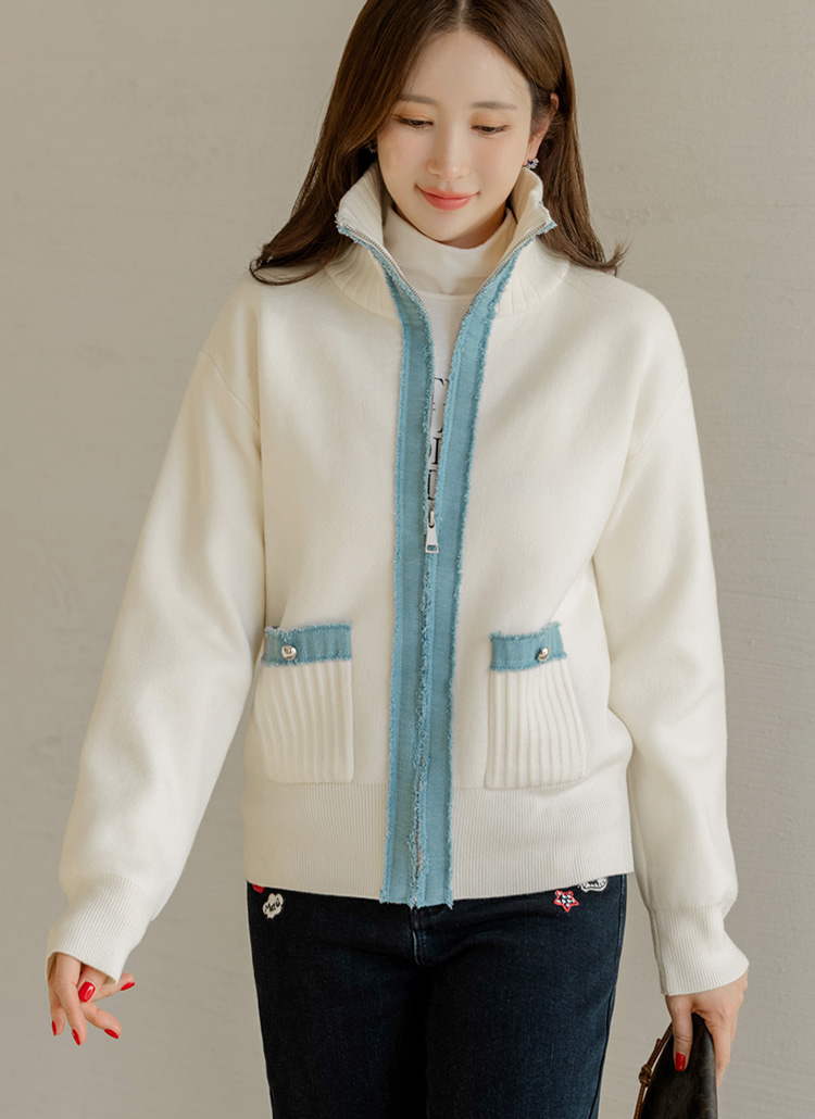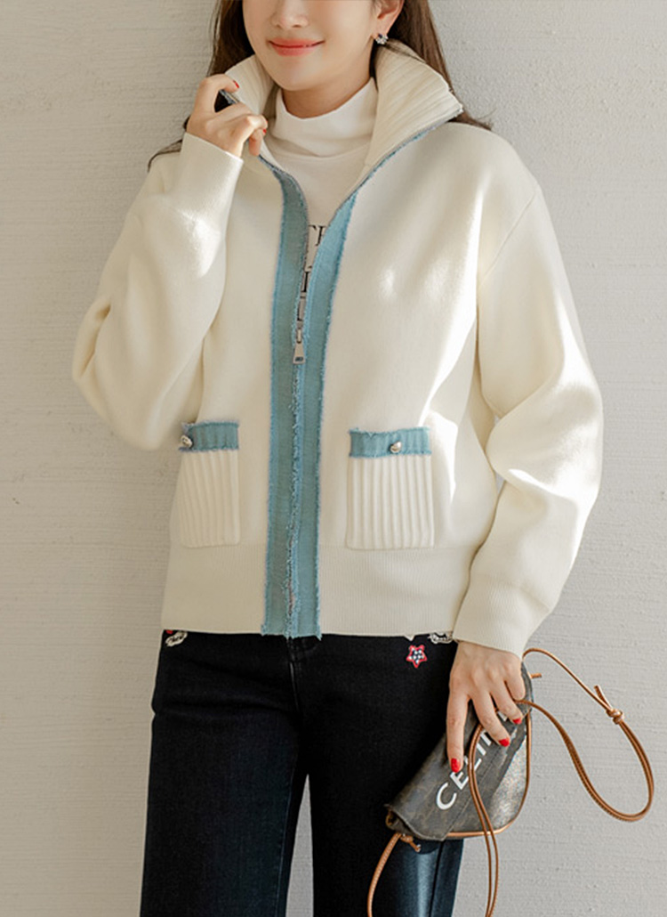 [A cozy knit zip-up cardigan highlighted with contrast denim trim and a flexible high-neck design, offering warm comfort, flattering coverage, and refined casual style.]