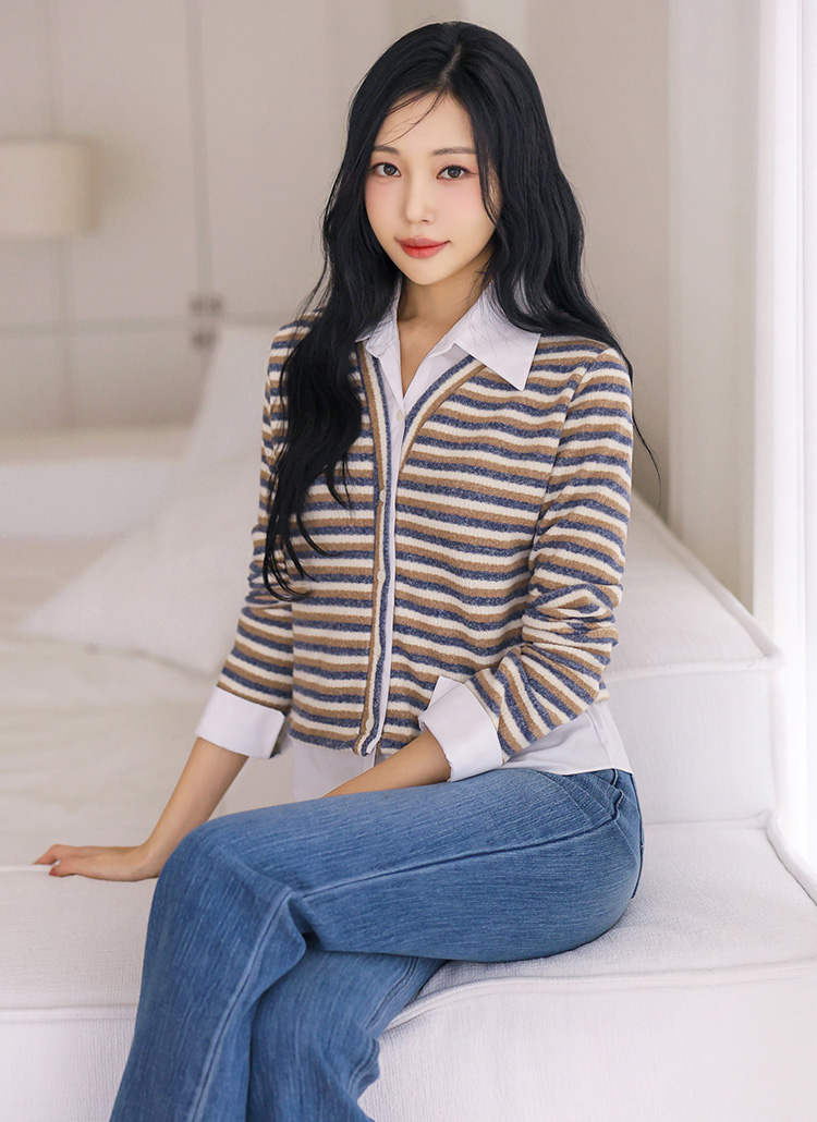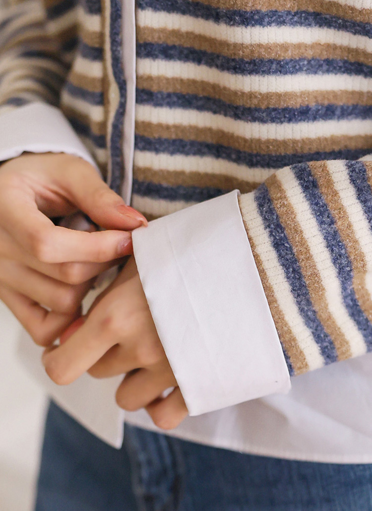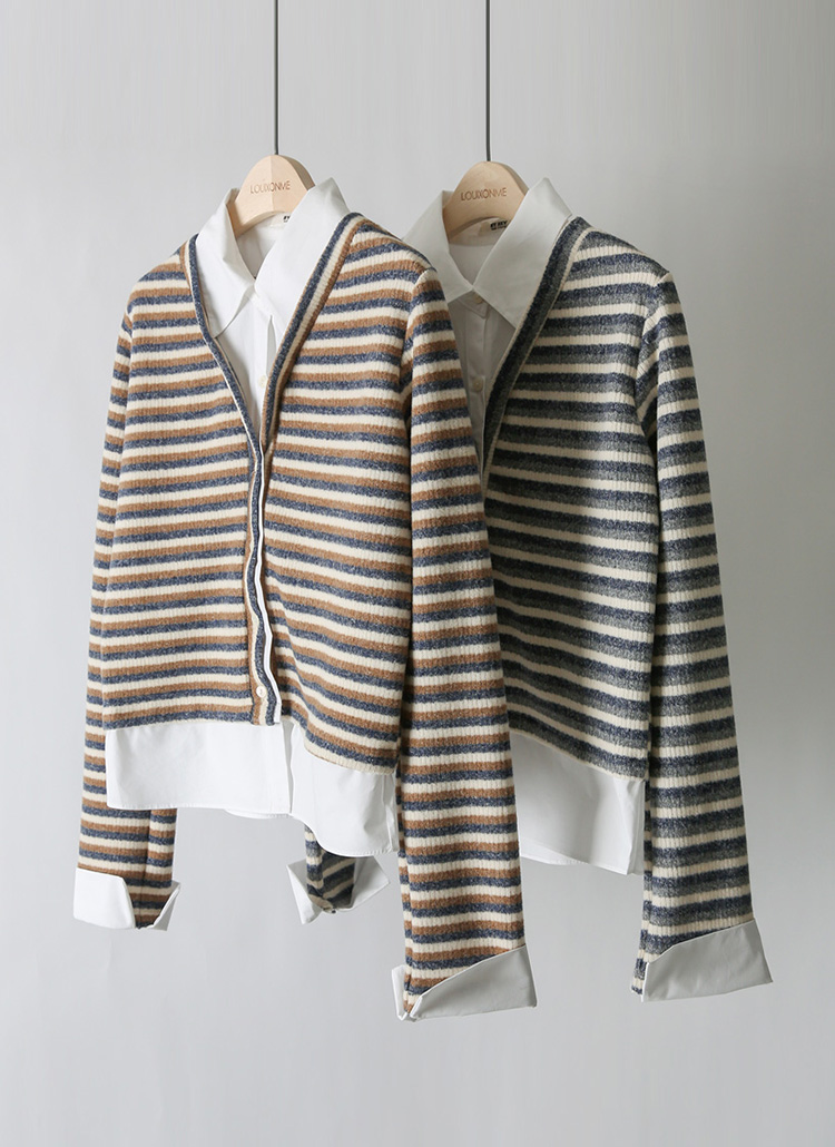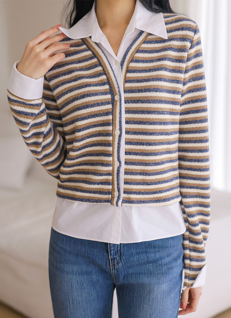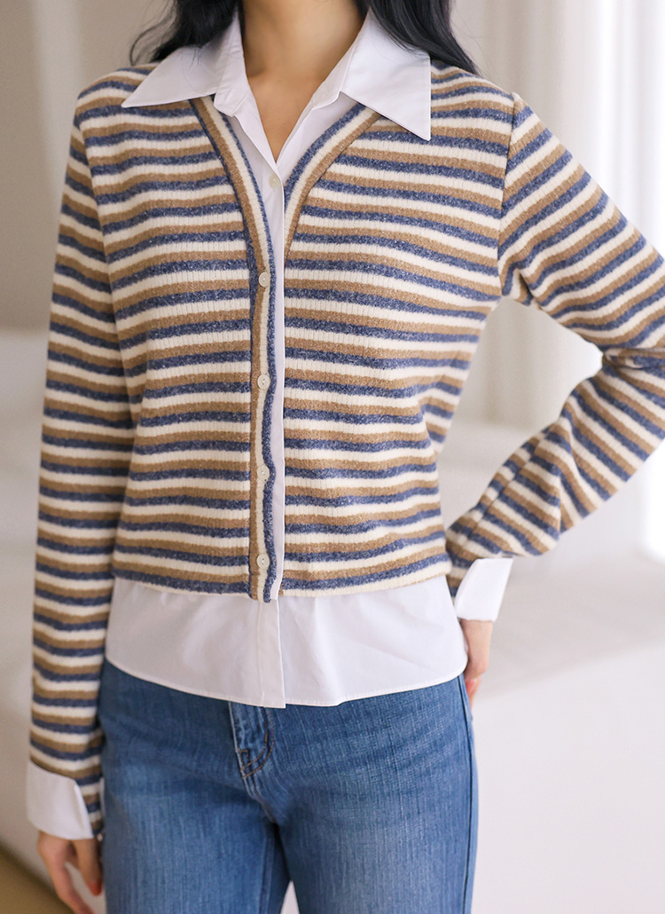 [A smart stripe knit cardigan with built-in shirt layering, offering cozy wool-blend warmth, a polished silhouette, and effortless styling for modern everyday outfits.]