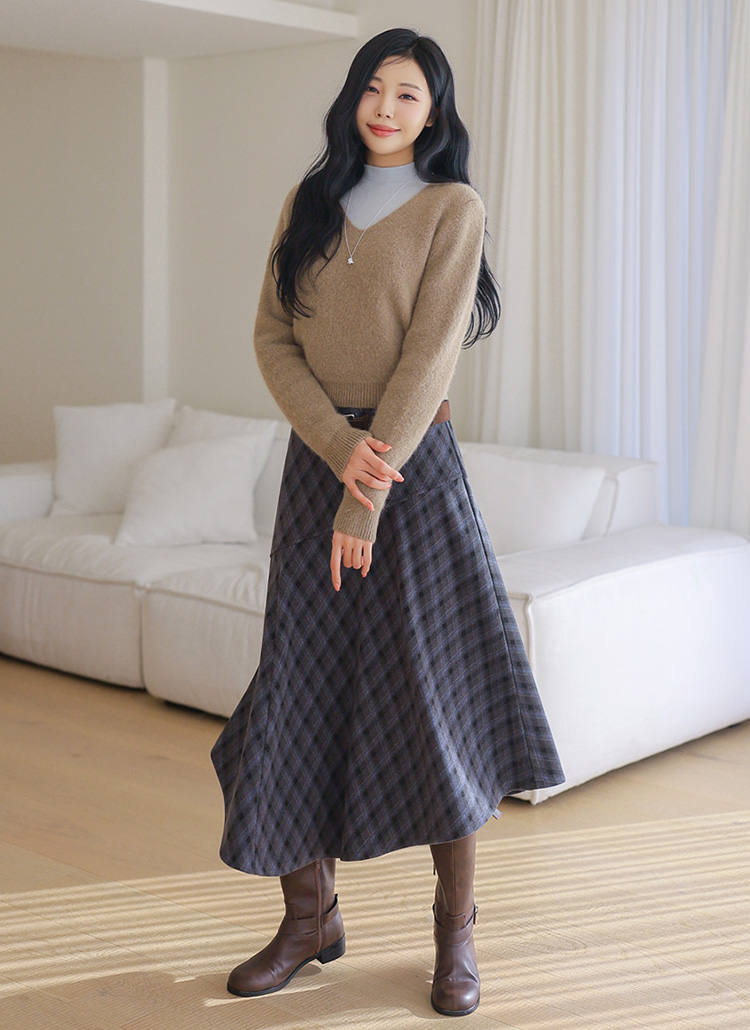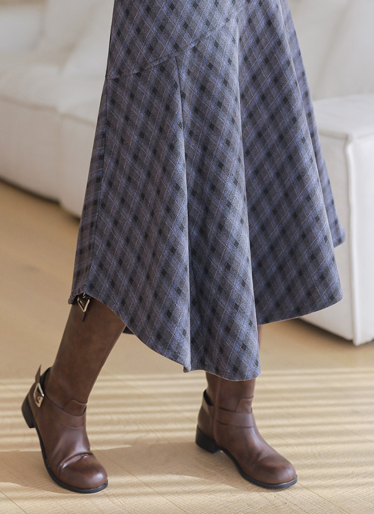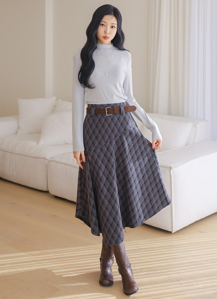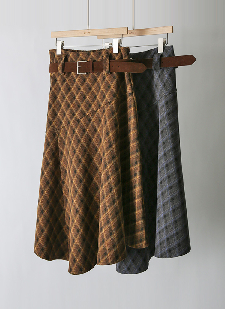 [This check flare midi skirt features diagonal panels, a suede-touch belt, and easy back elastic fit, offering polished movement and effortless elegance for seasonal wear.]