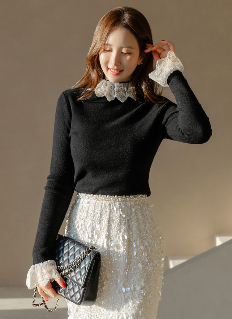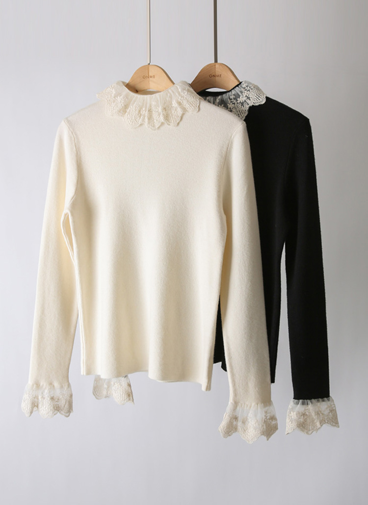 첼리스 시스루 에스닉 레이스 프릴 배색 톡톡 골지 반하이넥 니트