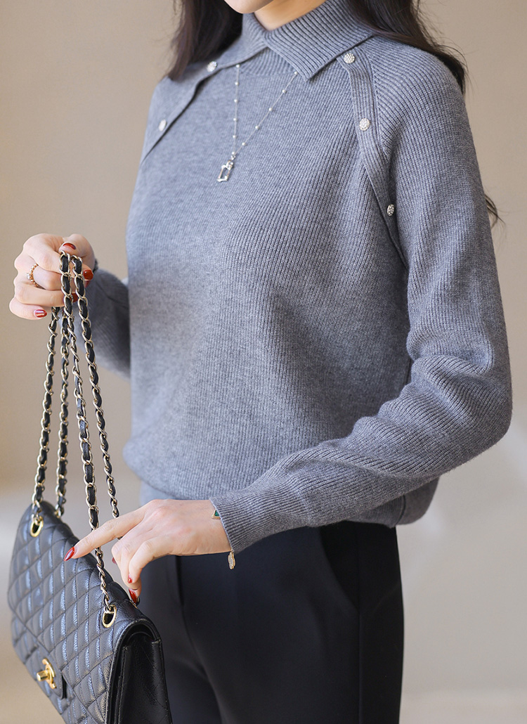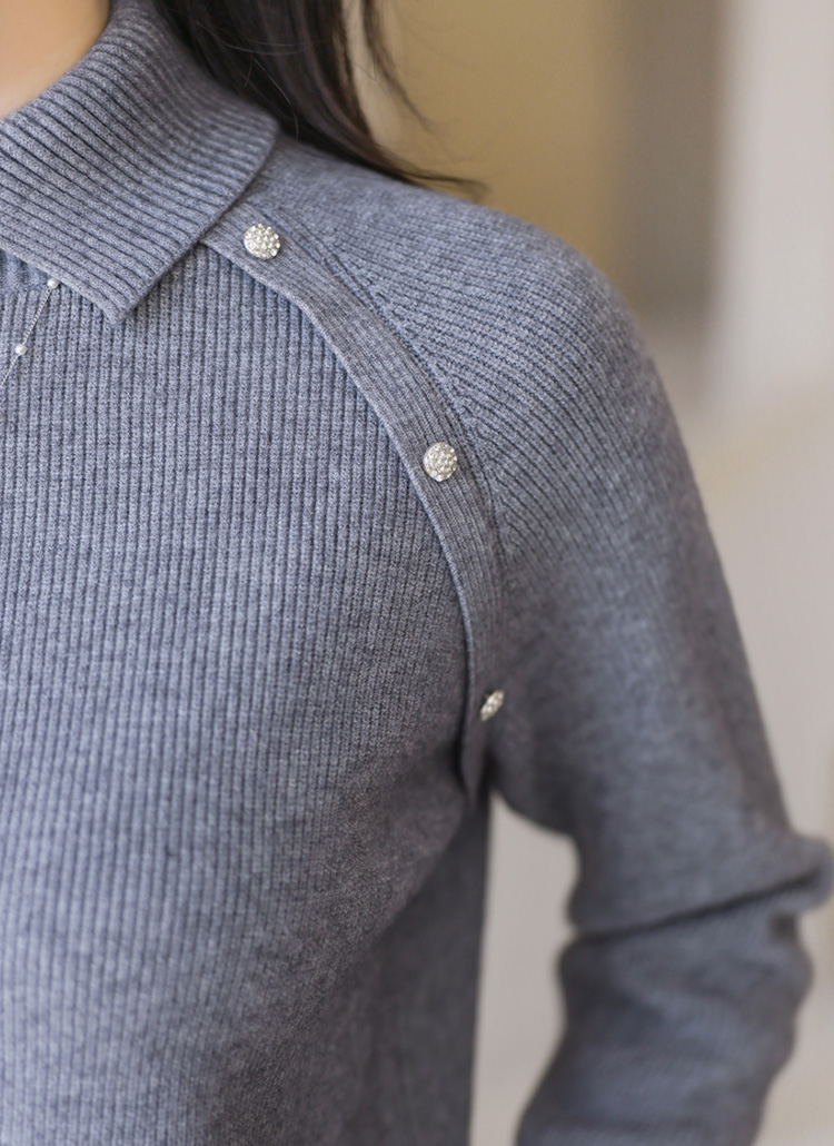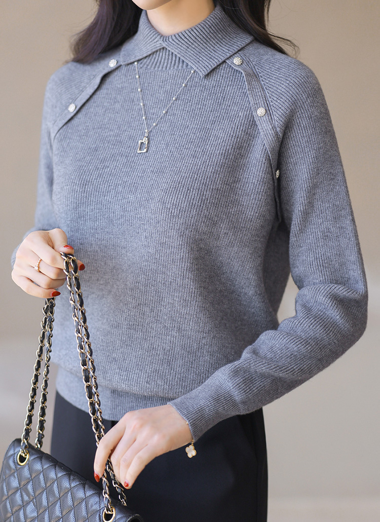 [This cozy ribbed knit features a semi-high collar and delicate button accents that brighten the look. A feminine essential ideal for office wear or smart everyday outfits.]