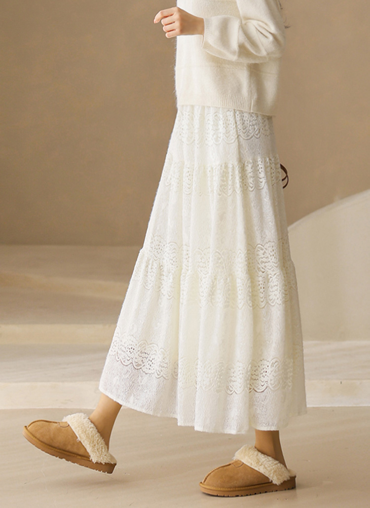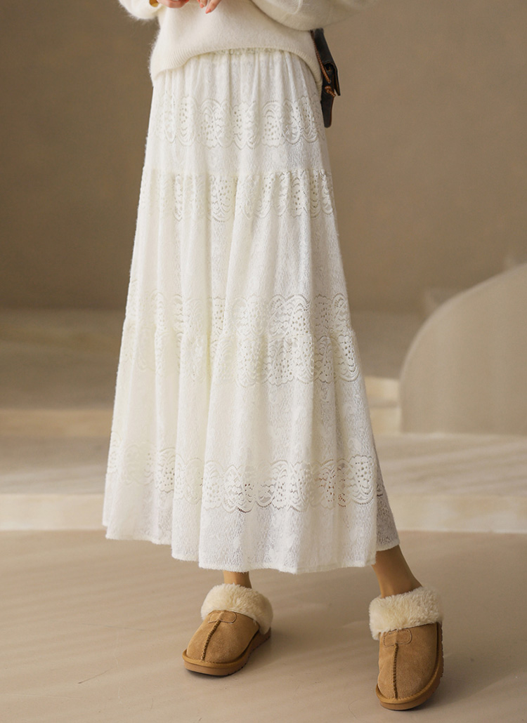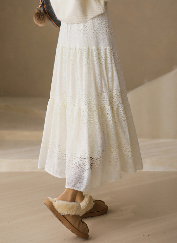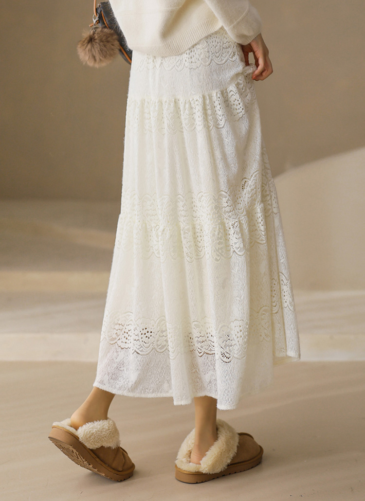 [Designed with delicate snow-pattern lace and a cozy inner lining, this flowing maxi skirt offers warmth, comfort, and an elegant tiered shape for feminine everyday looks.]