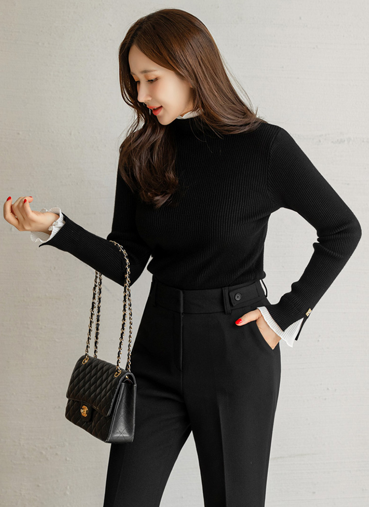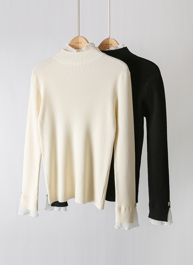 [A slim ribbed knit with sheer pleated frill trims at the neck and cuffs, blending knit comfort with blouse elegance for polished daily and office-ready styling.]