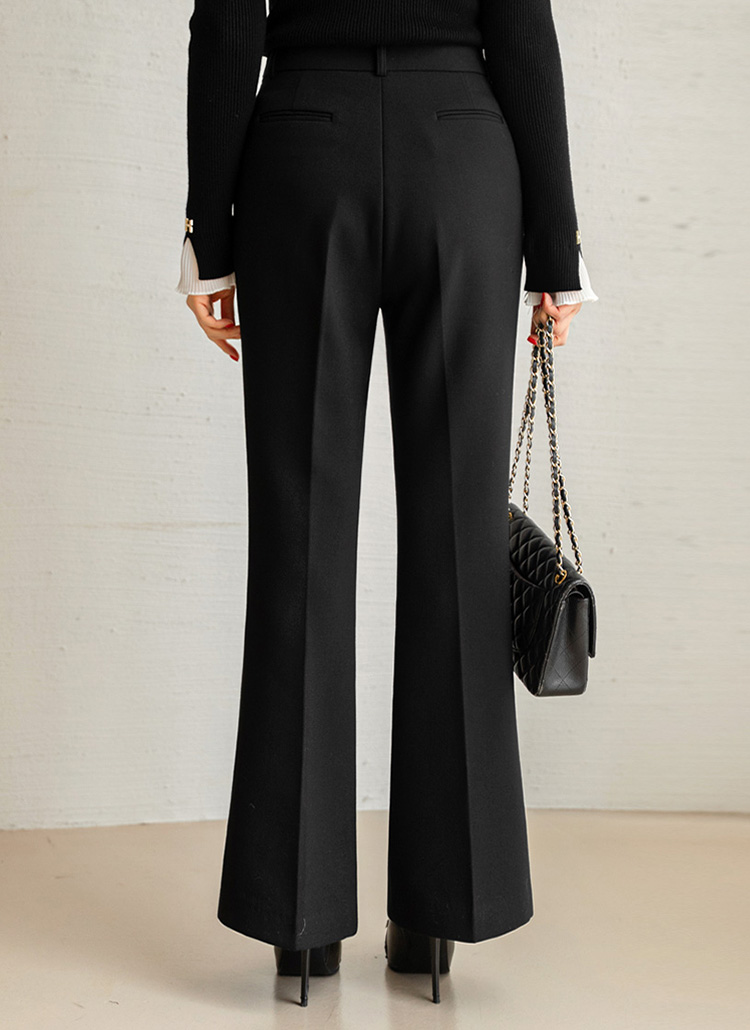 [Classic bootcut slacks with a refined button-tab waist and subtle stretch, designed to slim the hips and elongate the legs for polished office and formal styling.]