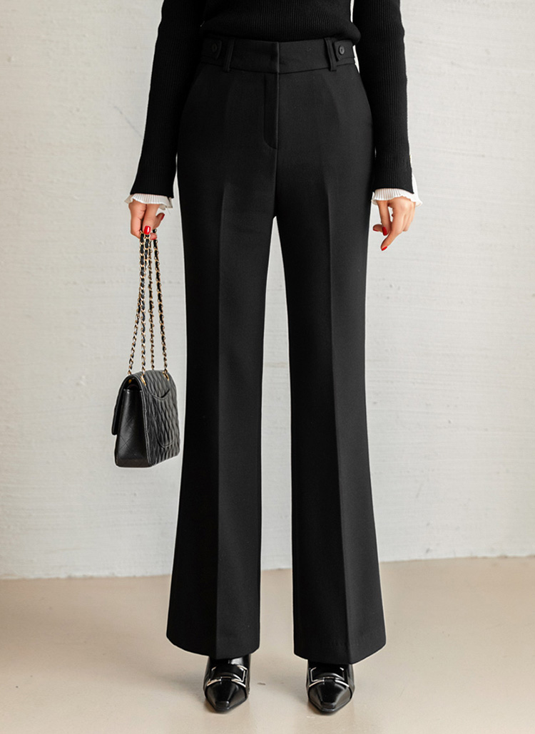 [Classic bootcut slacks with a refined button-tab waist and subtle stretch, designed to slim the hips and elongate the legs for polished office and formal styling.]