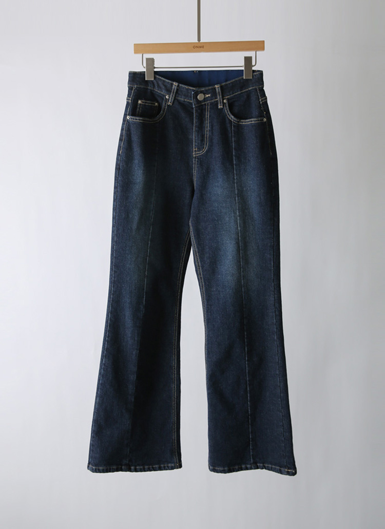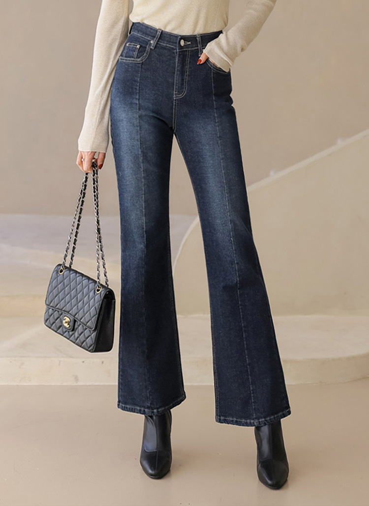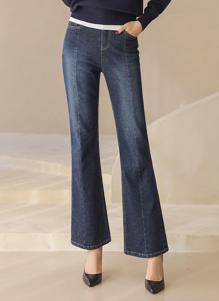 [Rich deep-blue bootcut denim with brushed lining delivers gentle warmth, a slimming center seam, hidden elastic waistband and stretch comfort for polished winter-to-spring daily styling.]