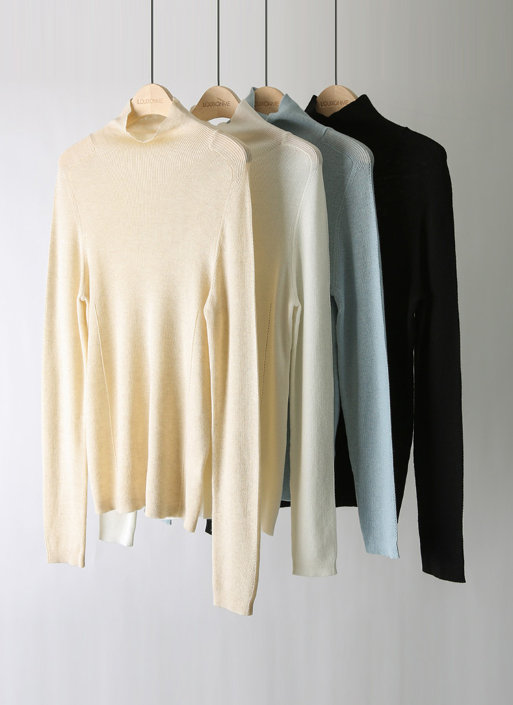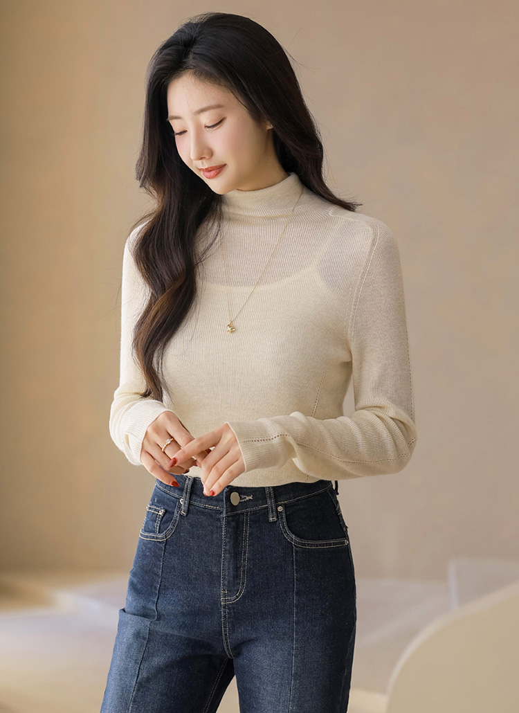 [Crafted from fine wool-blend yarn, this slim turtleneck features soft transparency and delicate punch details, creating a sleek silhouette ideal for everyday layering looks.]