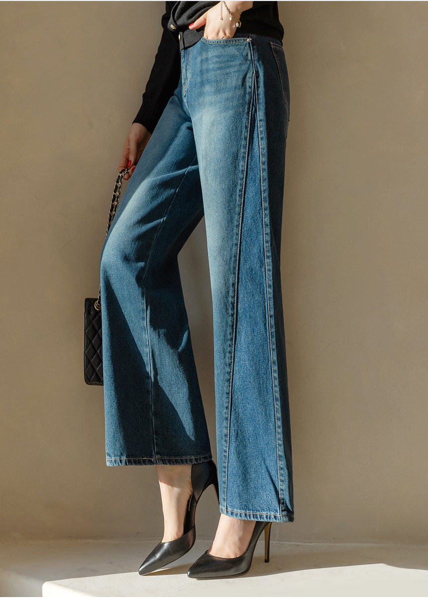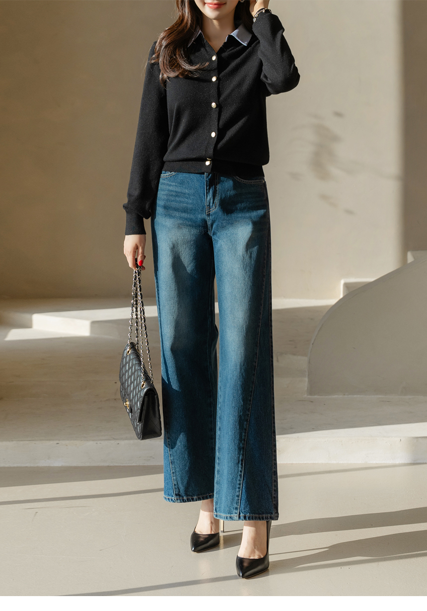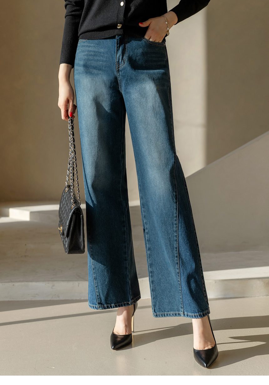 빌리드 사선 절개 라인 일자 세미 와이드 데님 팬츠