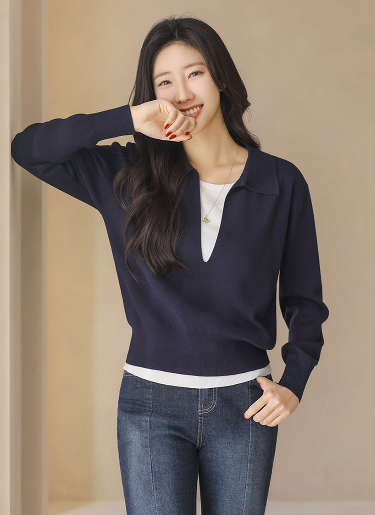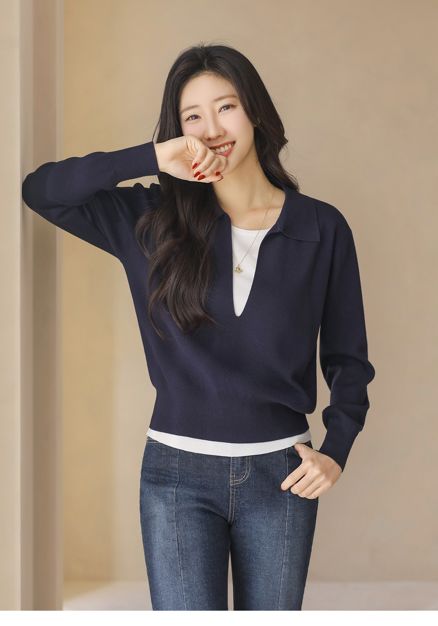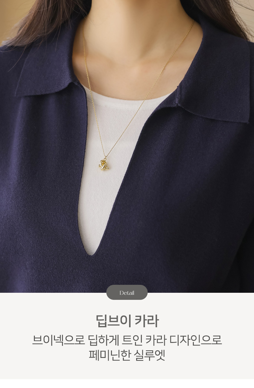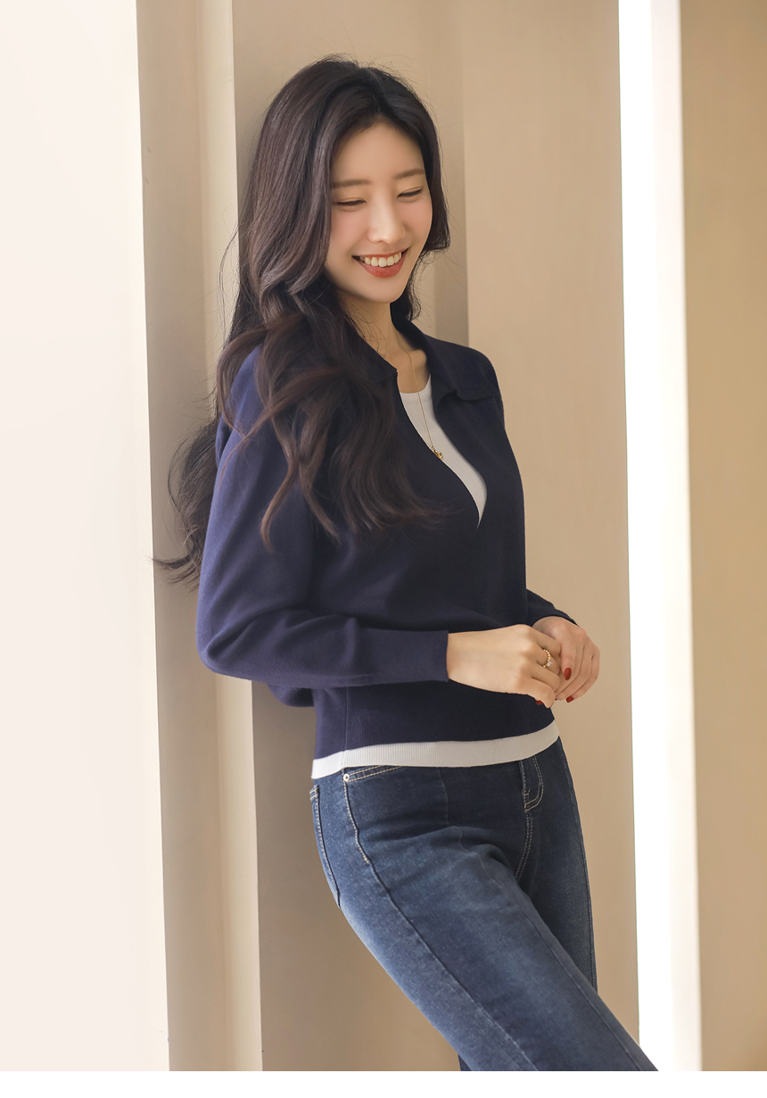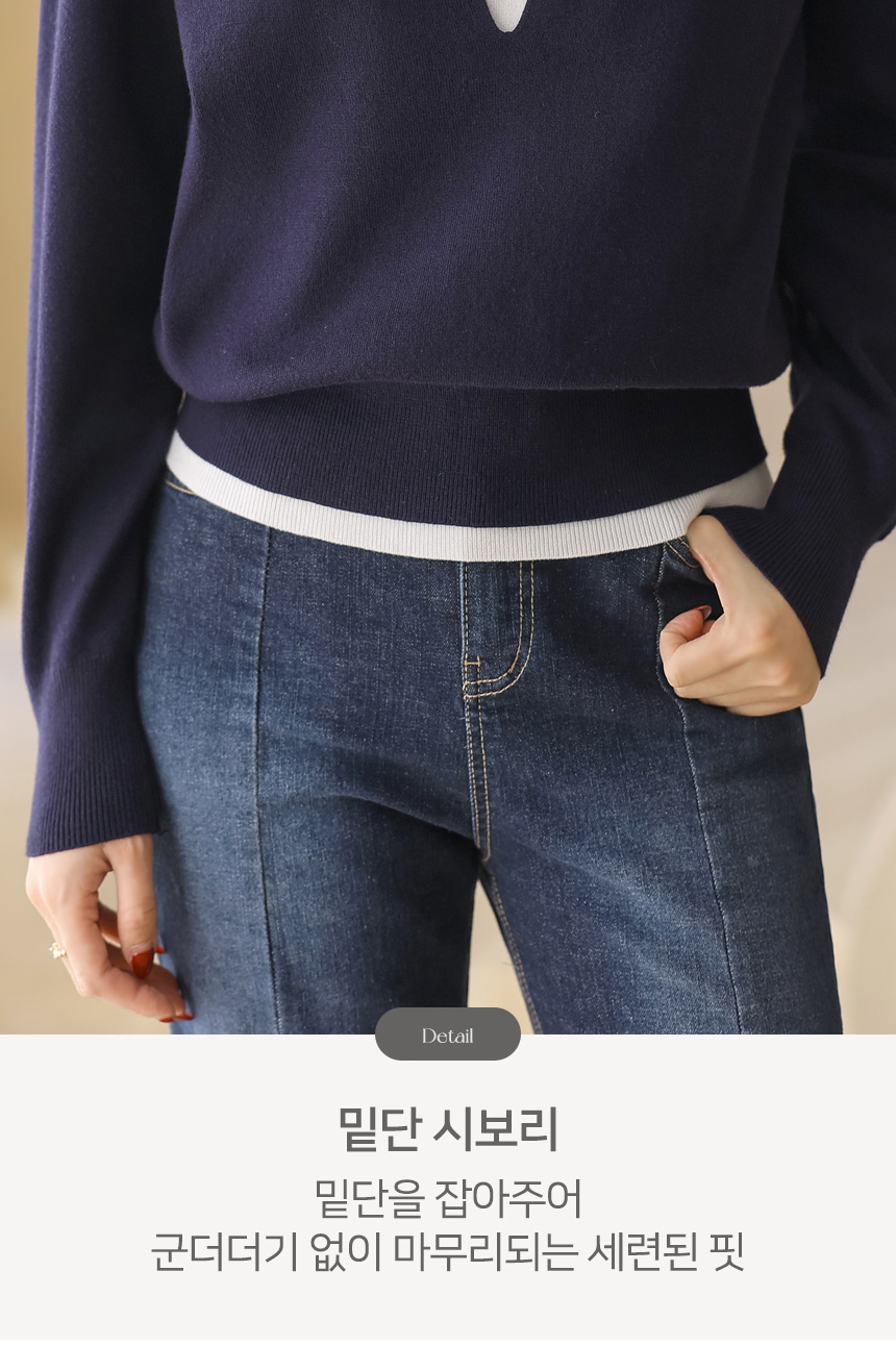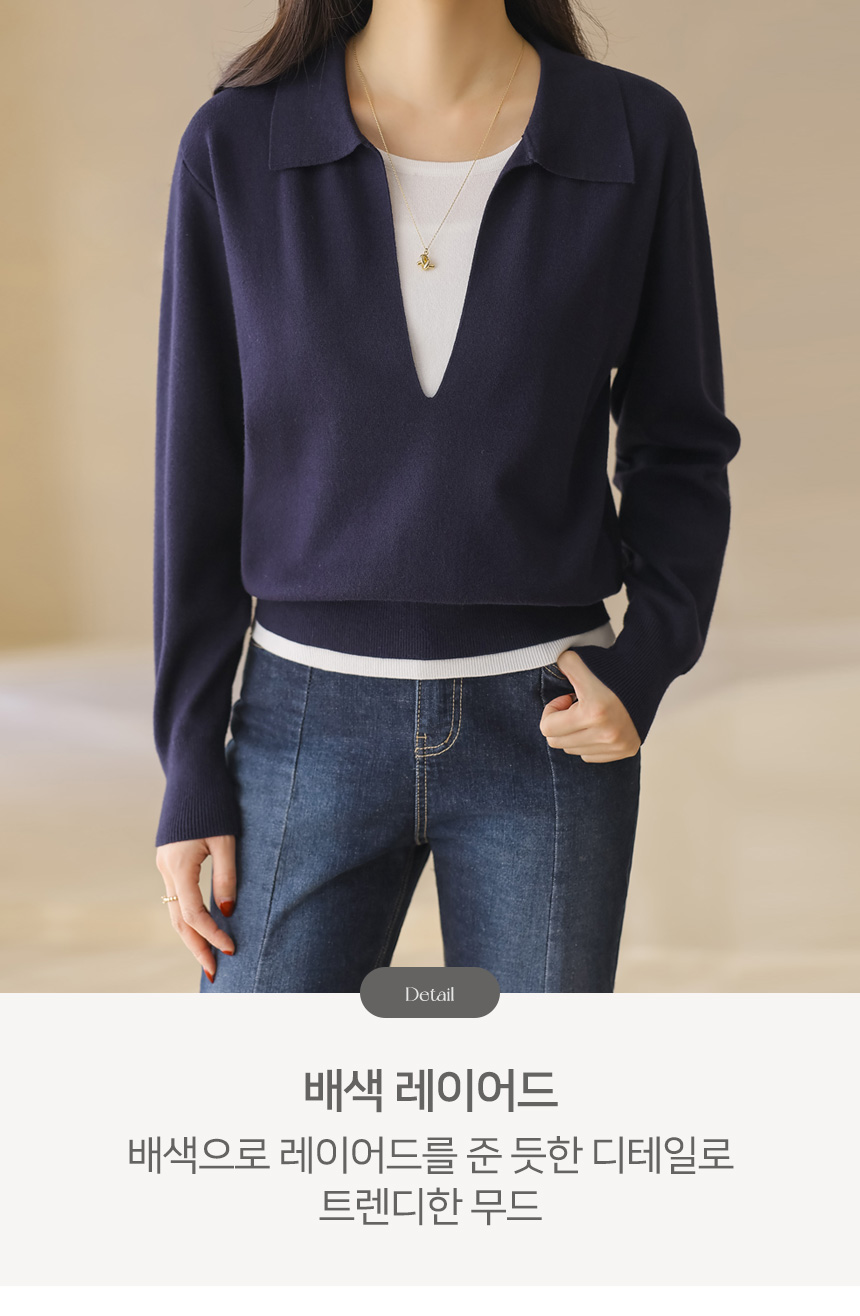 넥라인과 밑단에 더해진 배색 레이어드 디테일이