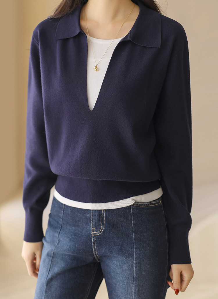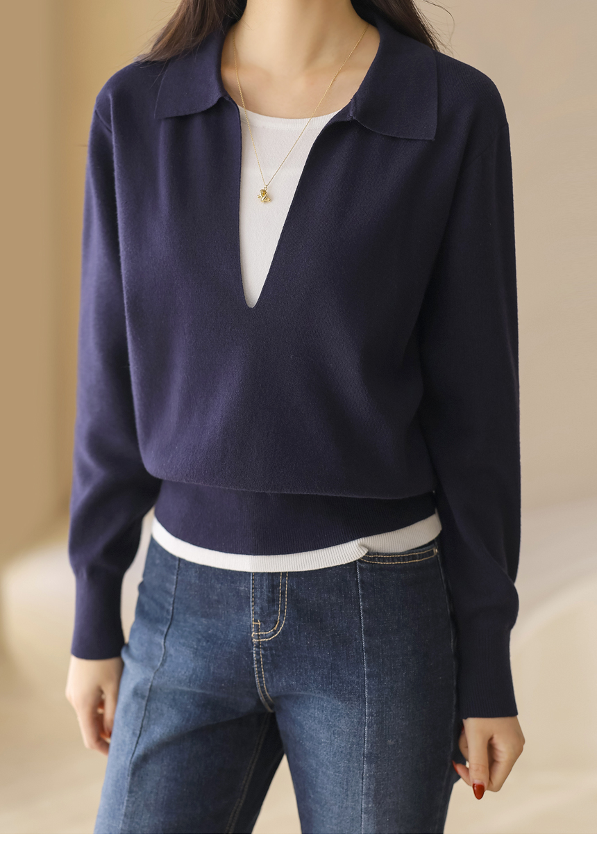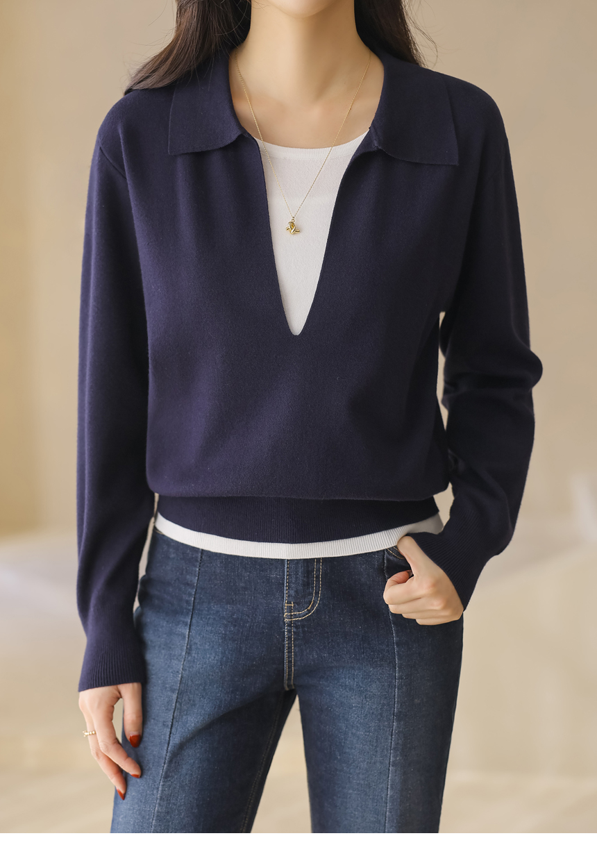 [This deep V collared knit features smart layered color accents, a clean fit, and smooth rayon-blend texture, delivering effortless elegance for work or casual styling.]