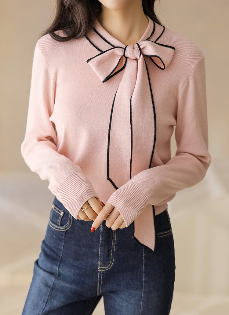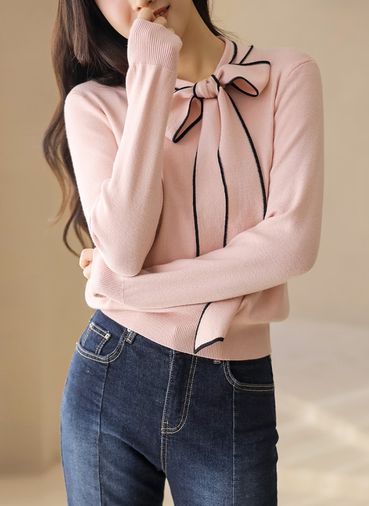 [This smooth knit sweater highlights a contrast ribbon tie at the neckline, offering versatile styling and a refined silhouette ideal for elegant casual outfits.]