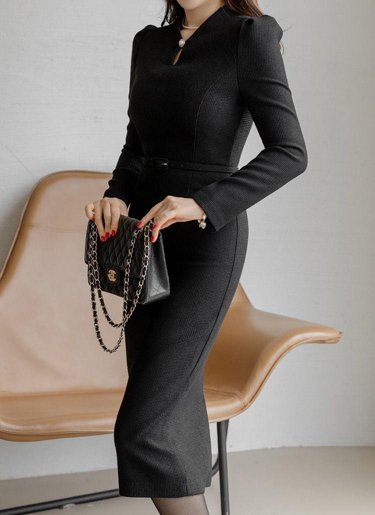 [Featuring a streamlined silhouette, matching waist belt, and pearl-accent slit neckline, this midi dress delivers graceful structure and elevated style for important moments.]