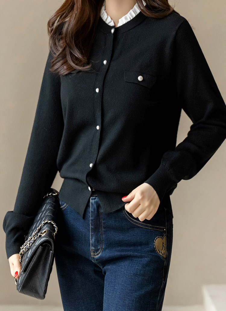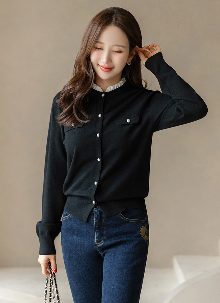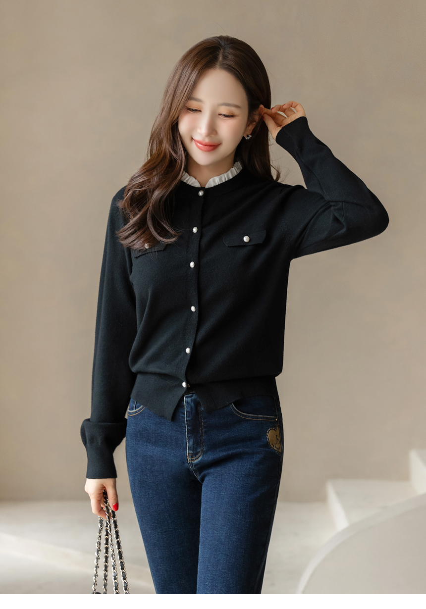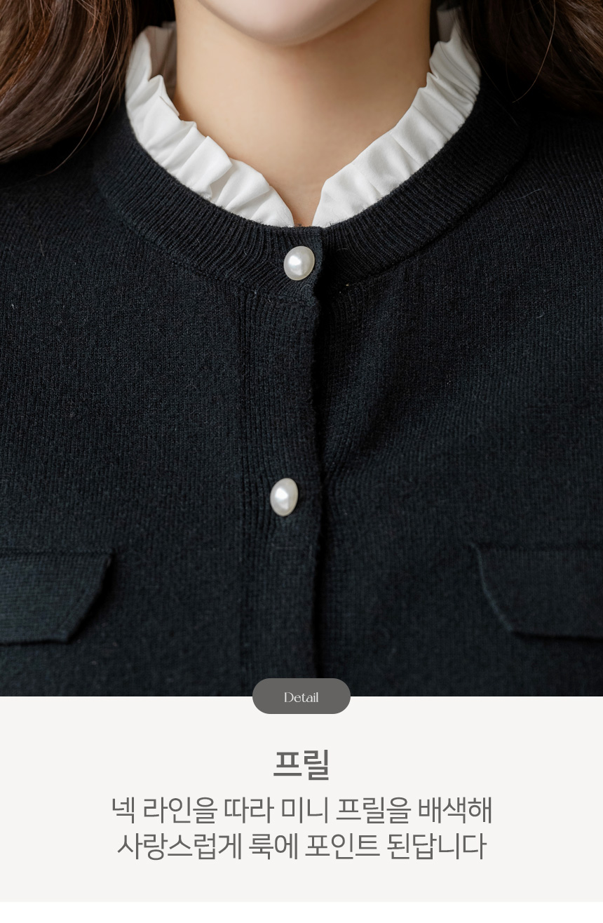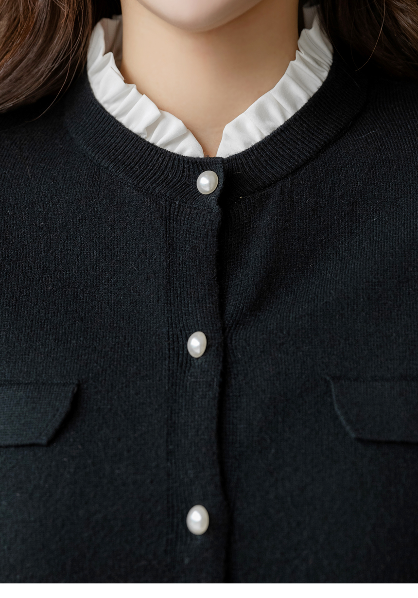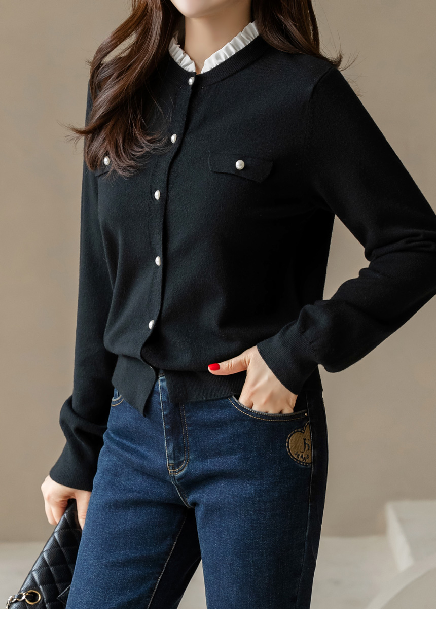 [A refined knit cardigan with delicate frill neckline and pearl buttons, offering soft stretch, balanced structure, and effortless elegance for everyday to polished looks.]