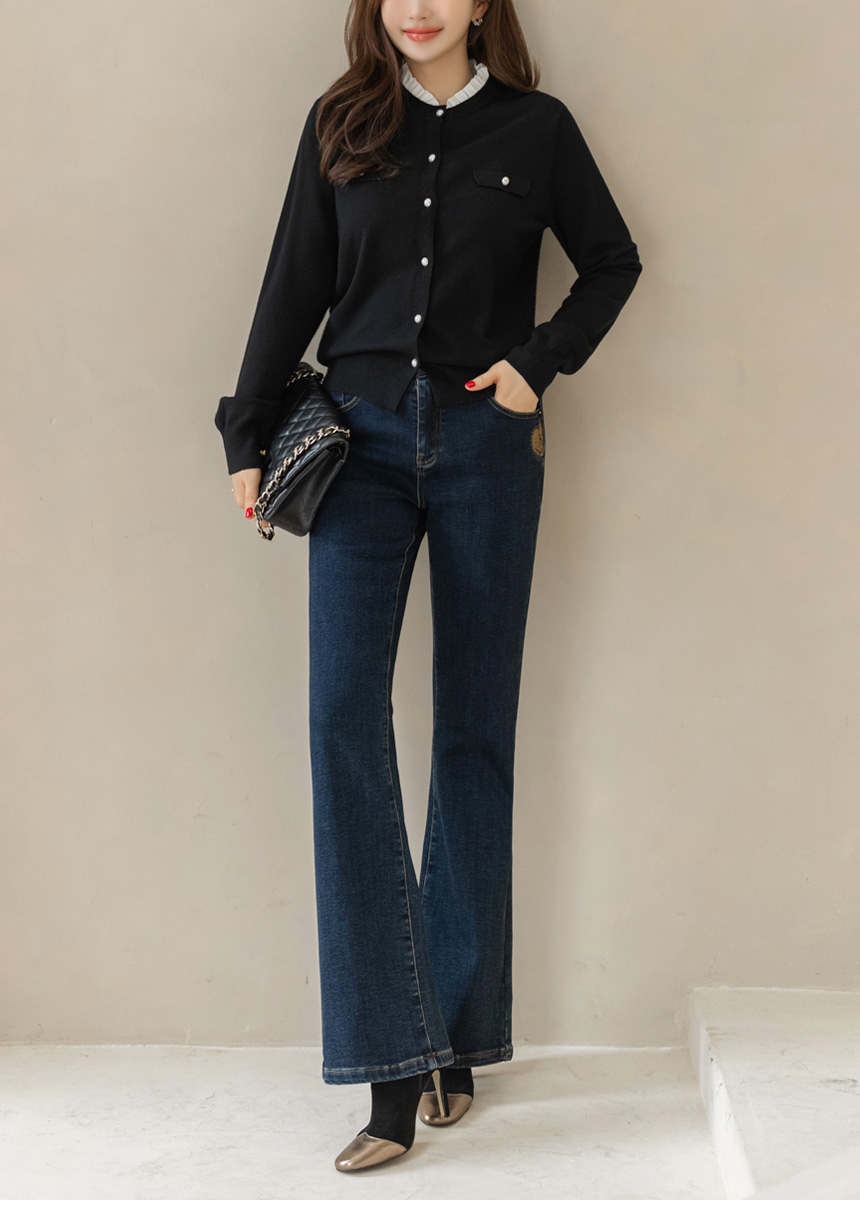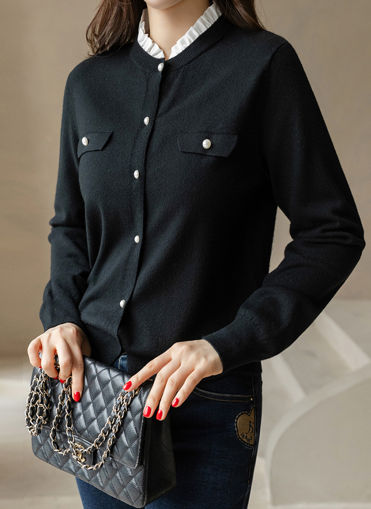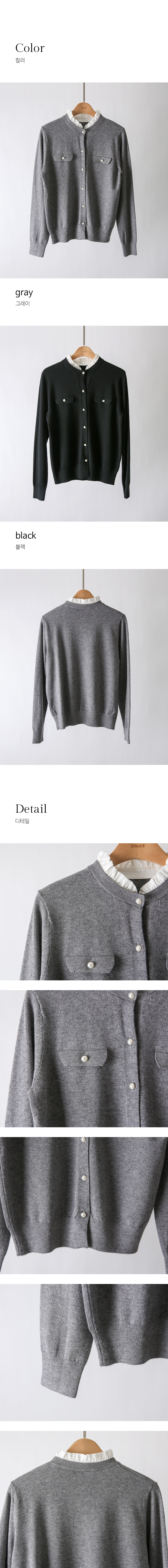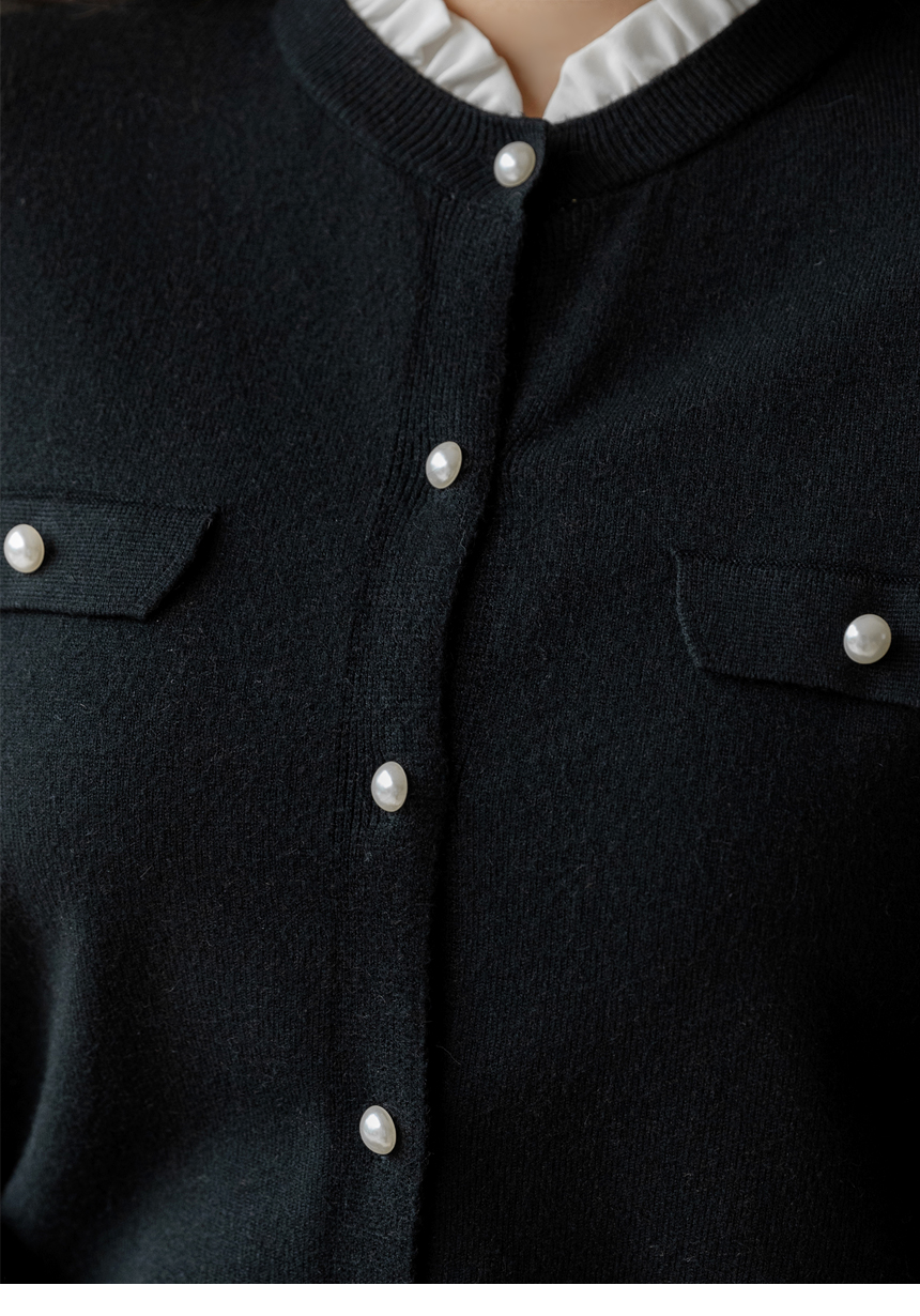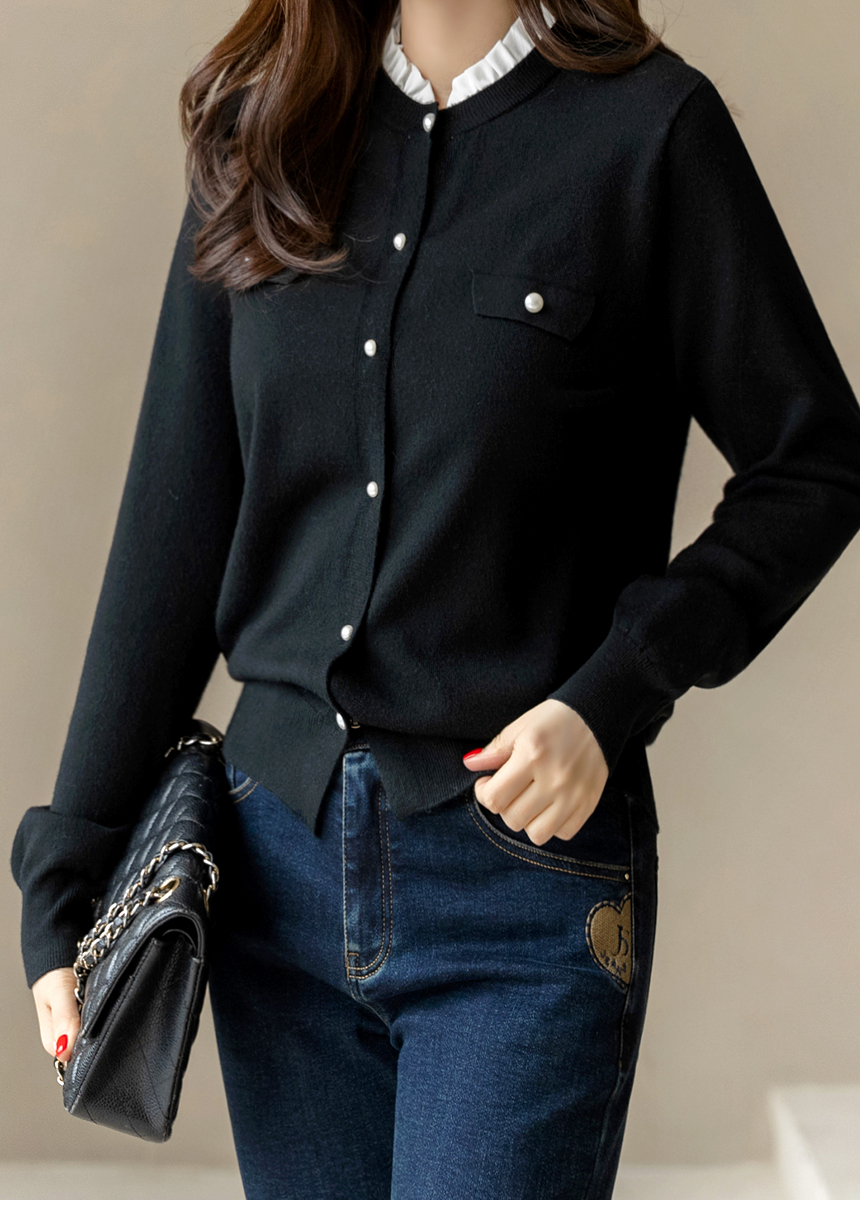 [A refined knit cardigan with delicate frill neckline and pearl buttons, offering soft stretch, balanced structure, and effortless elegance for everyday to polished looks.]