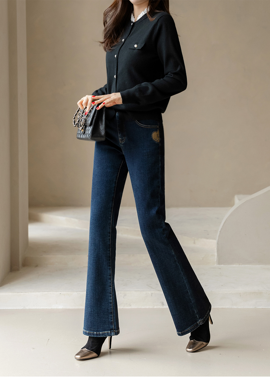 • Slim bootcut denim with subtle gold-tone stitching and heart embroidery, featuring soft fleece lining, hidden waistband comfort, and stretch for warm, flattering daily wear.