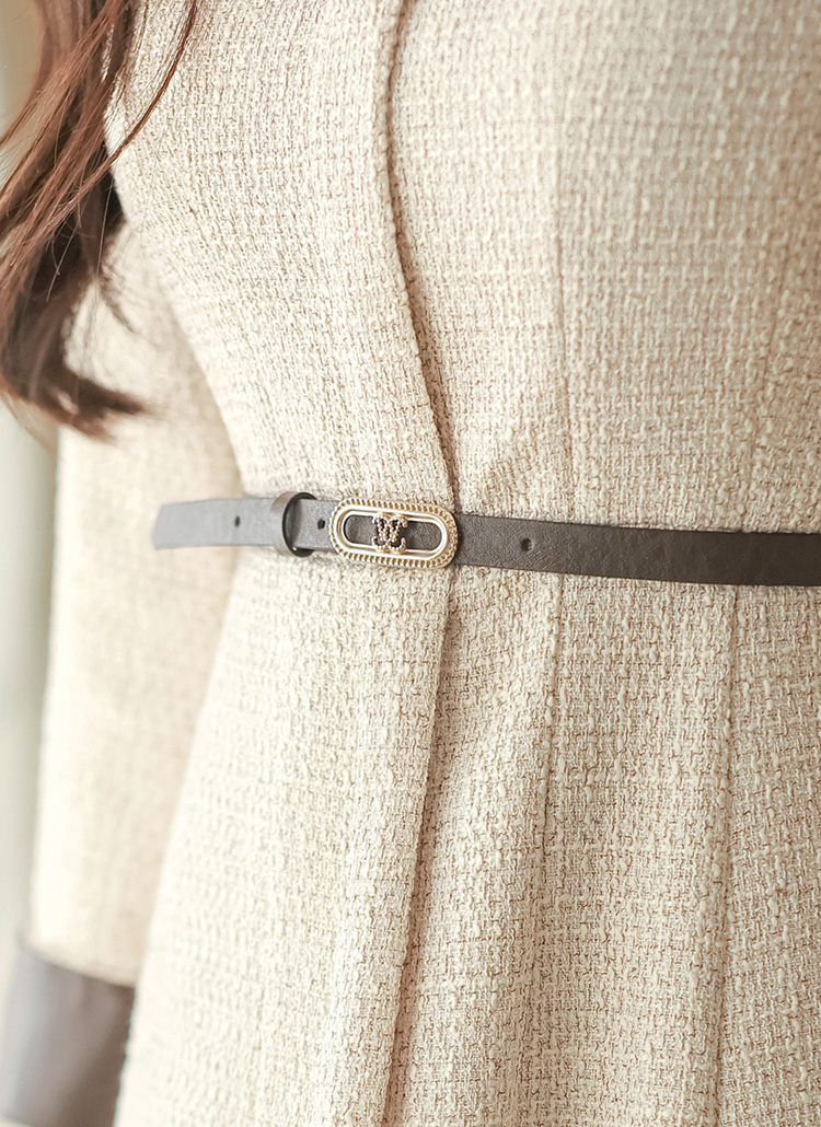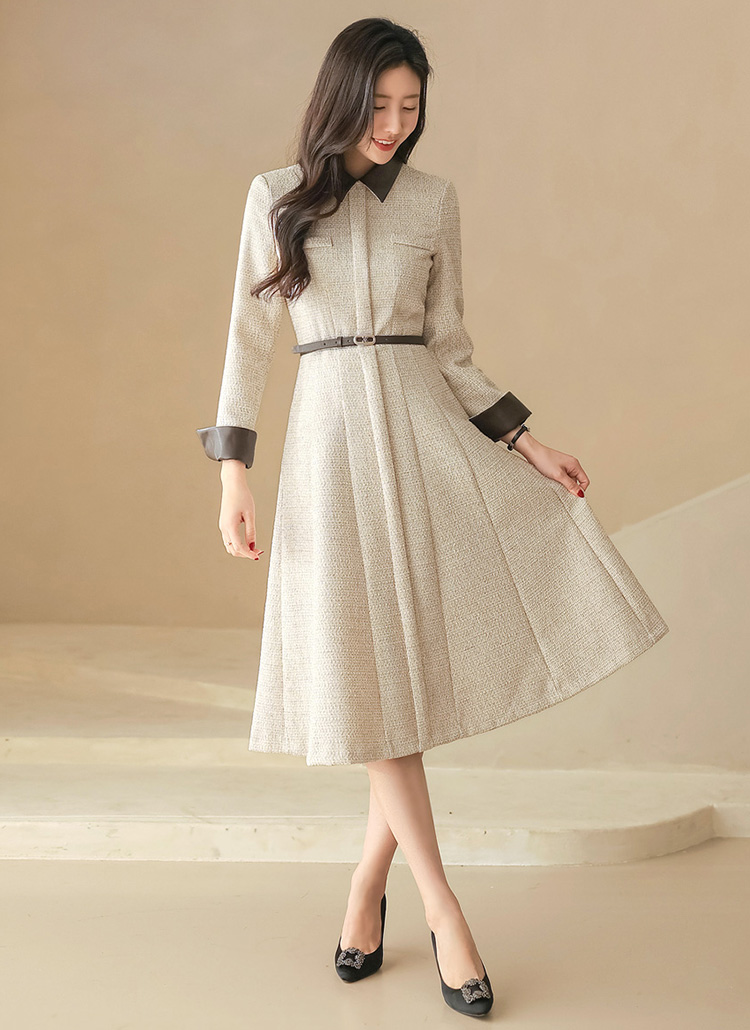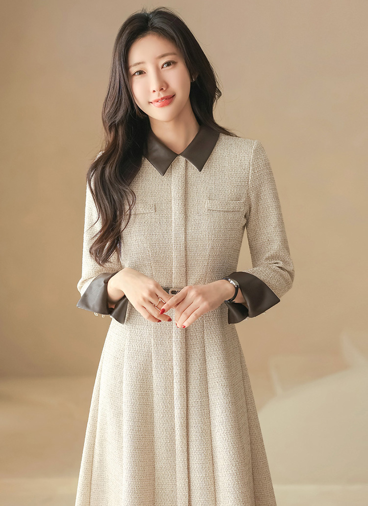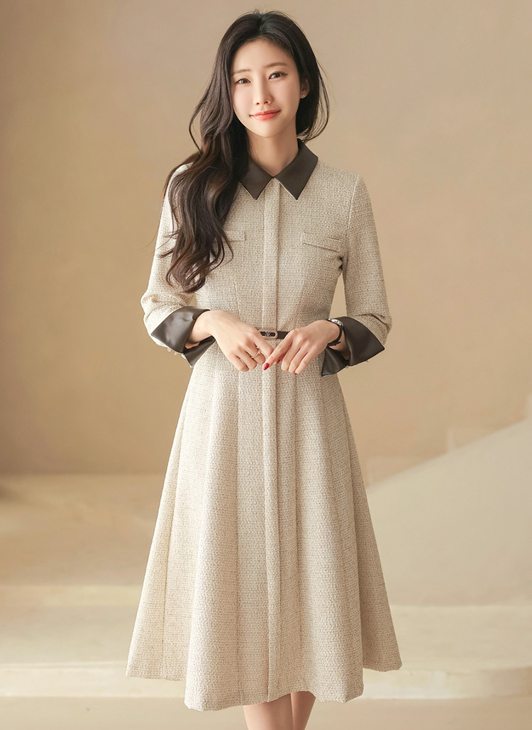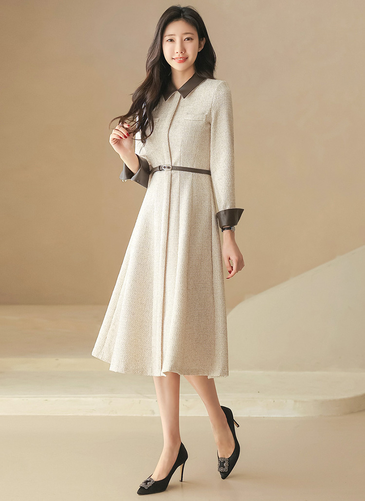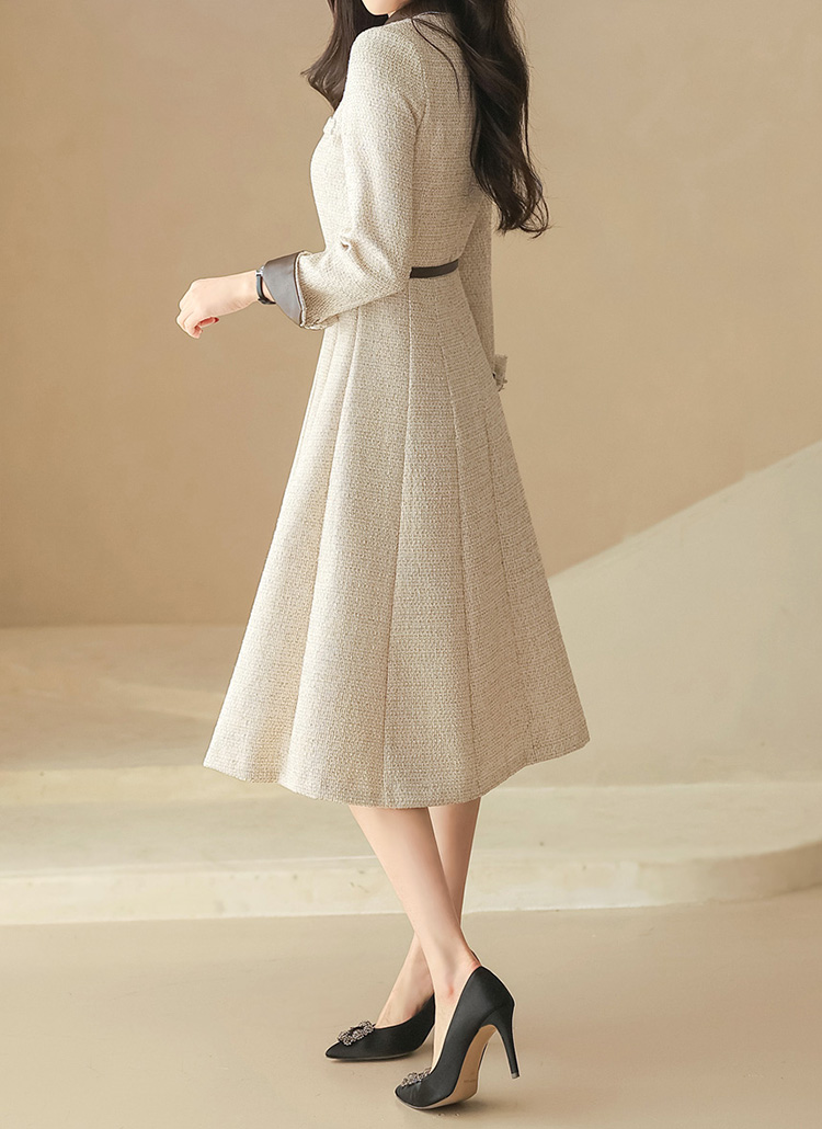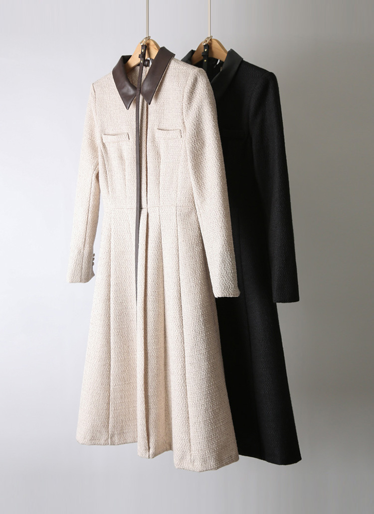 [Elegant tweed texture meets sleek leather accents at the collar and cuffs, finished with a belt set and flattering flare silhouette for timeless, polished styling.]
