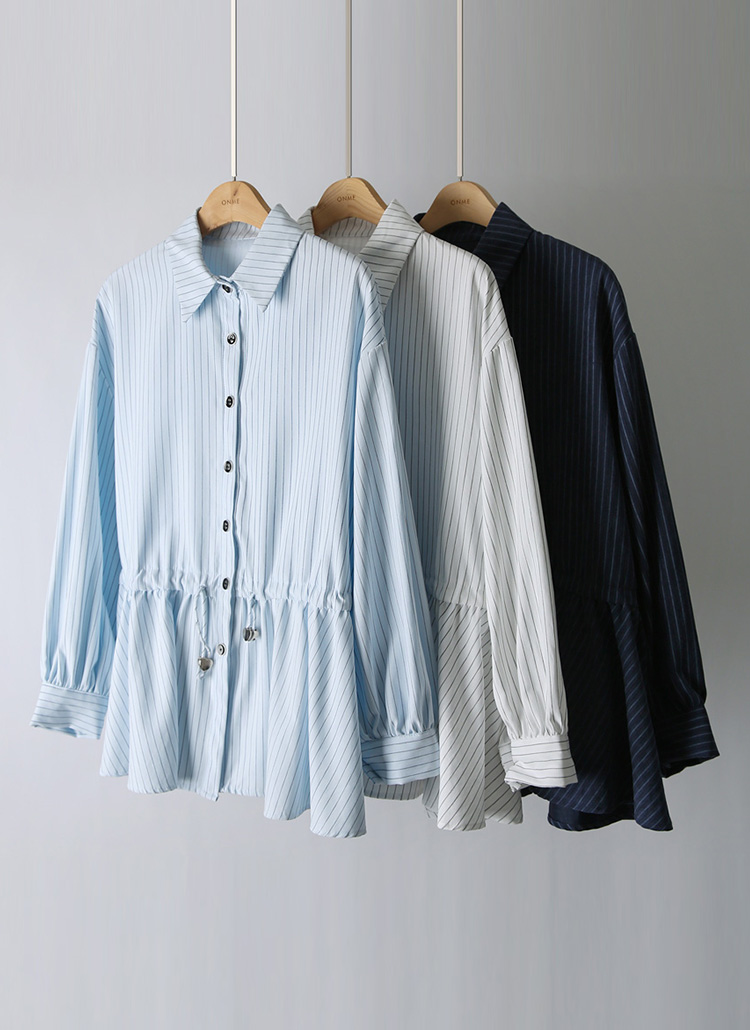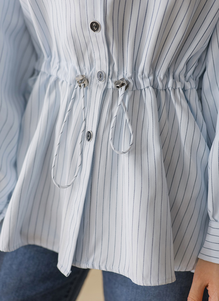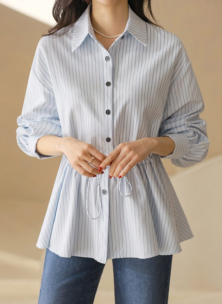 [A clean striped blouse with adjustable waist ties and a softly flared hem, delivering a flattering fit that transitions easily from work settings to casual days.]