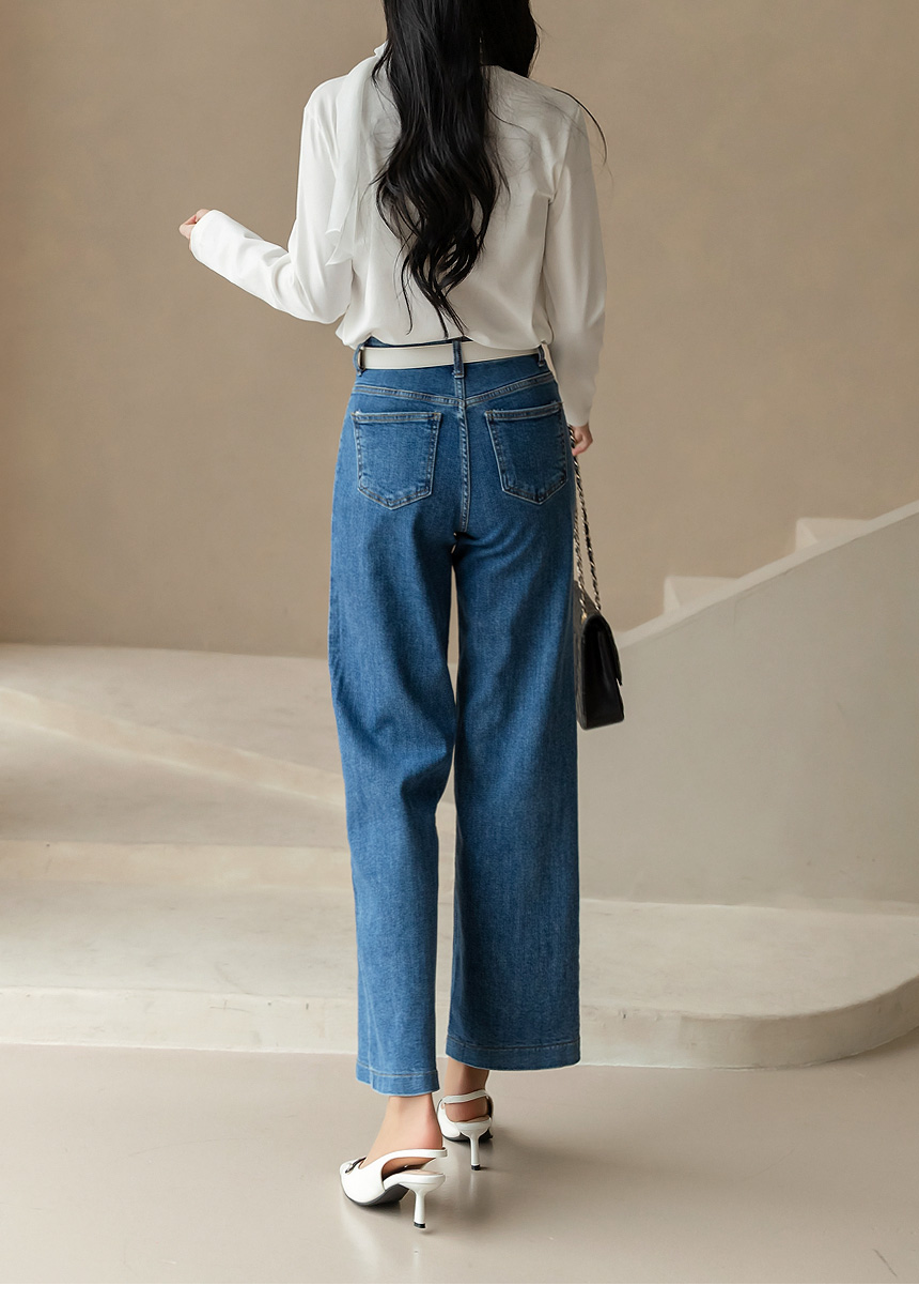 [Designed in a relaxed straight semi-wide fit, these denim pants feature hidden waistband comfort and subtle stretch, creating a clean silhouette that feels effortless, polished, and easy to wear daily.]