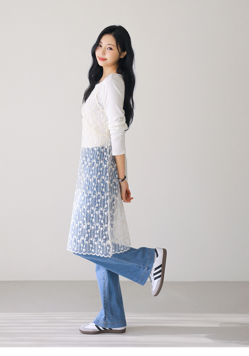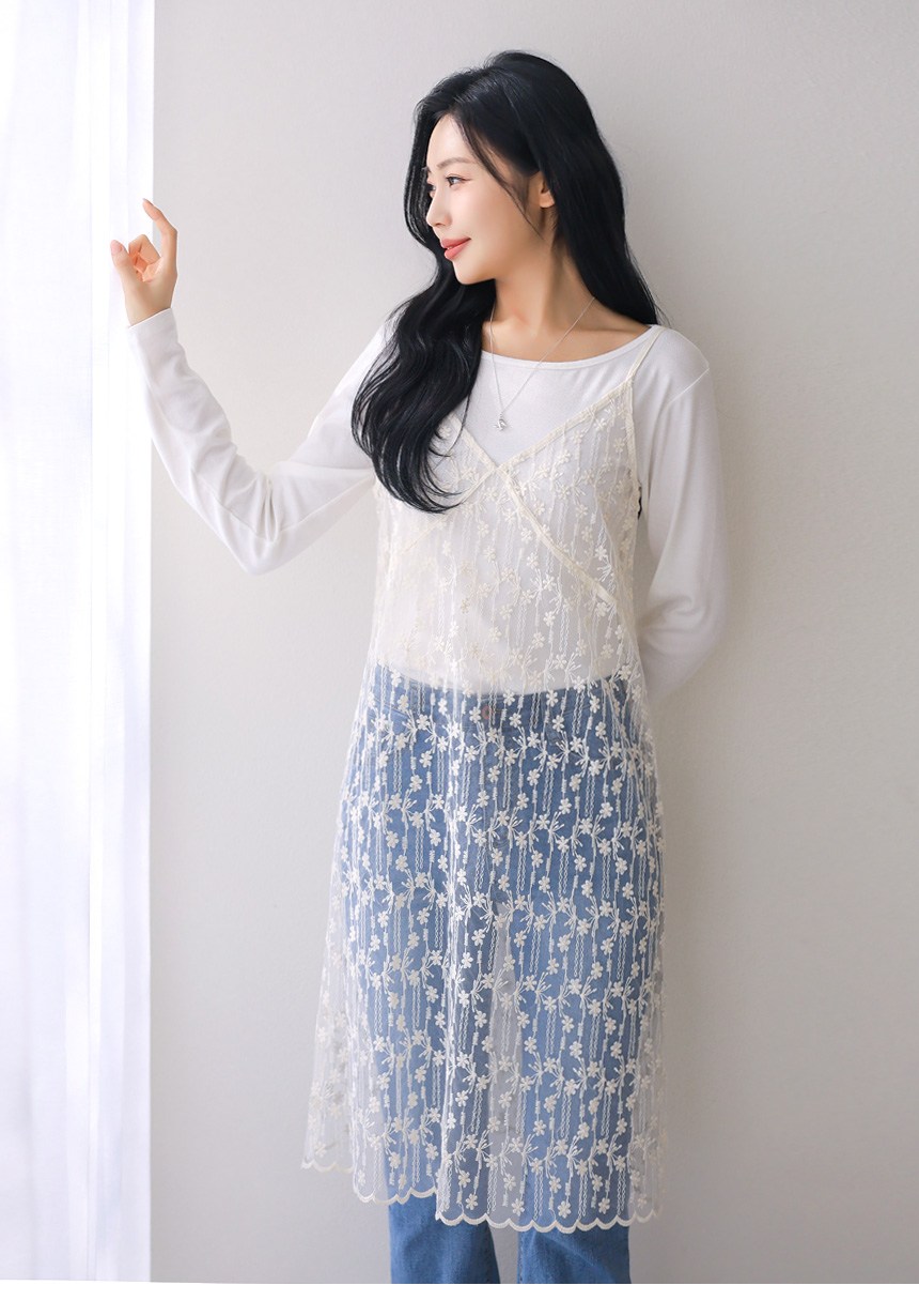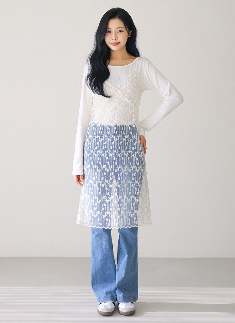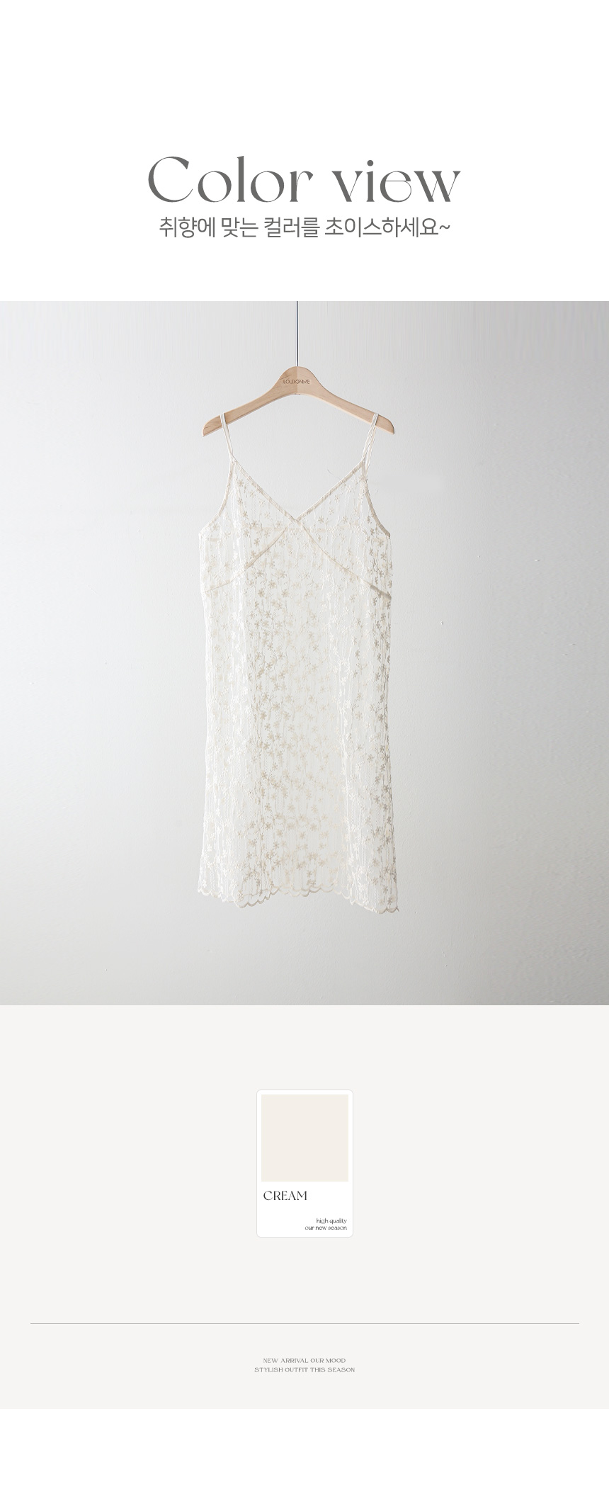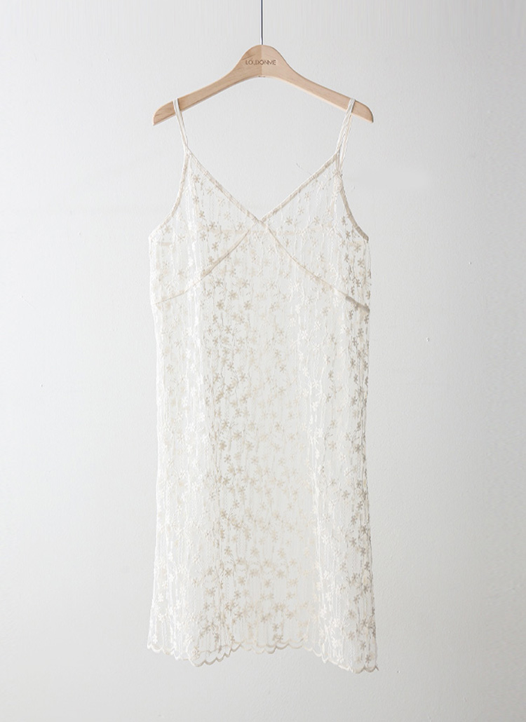 [A delicate sheer lace bustier dress designed for effortless layering, featuring fine floral embroidery, adjustable straps, and a light silhouette that elevates simple tops with feminine, trendy appeal.]