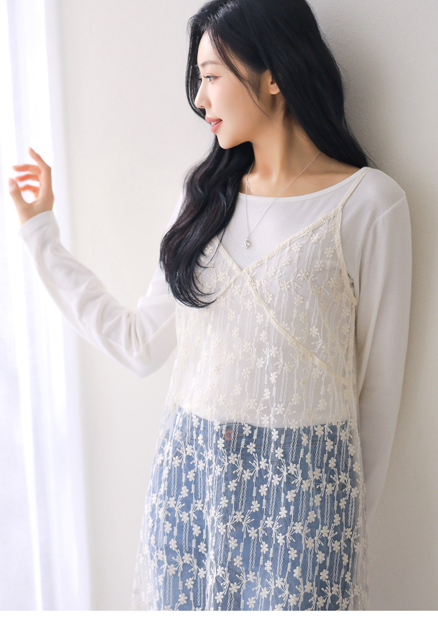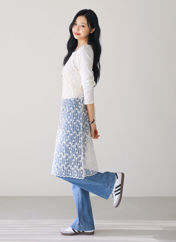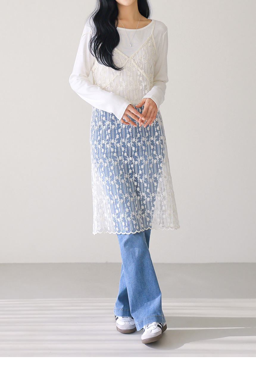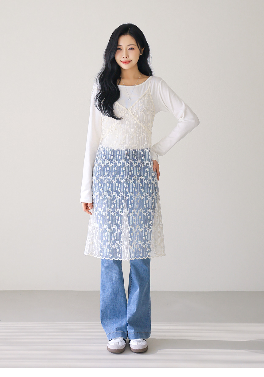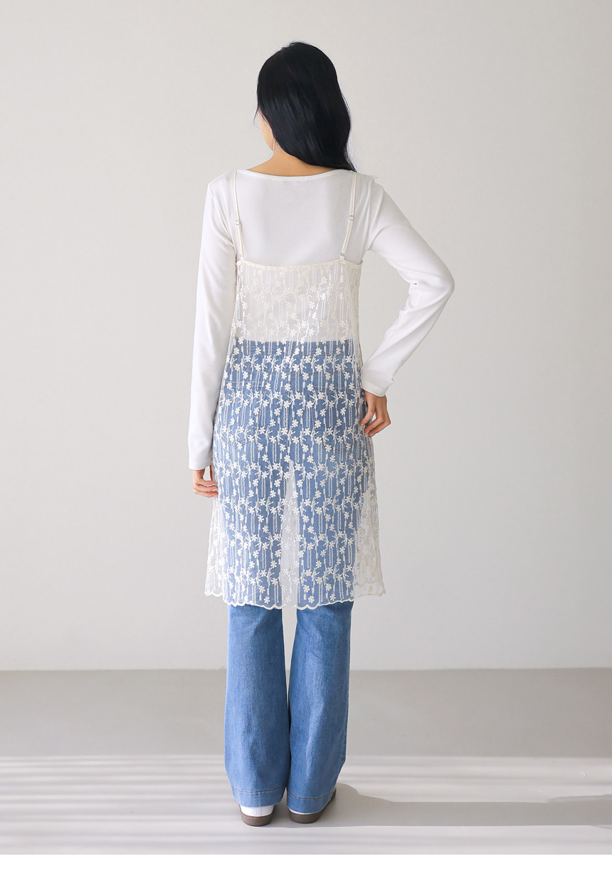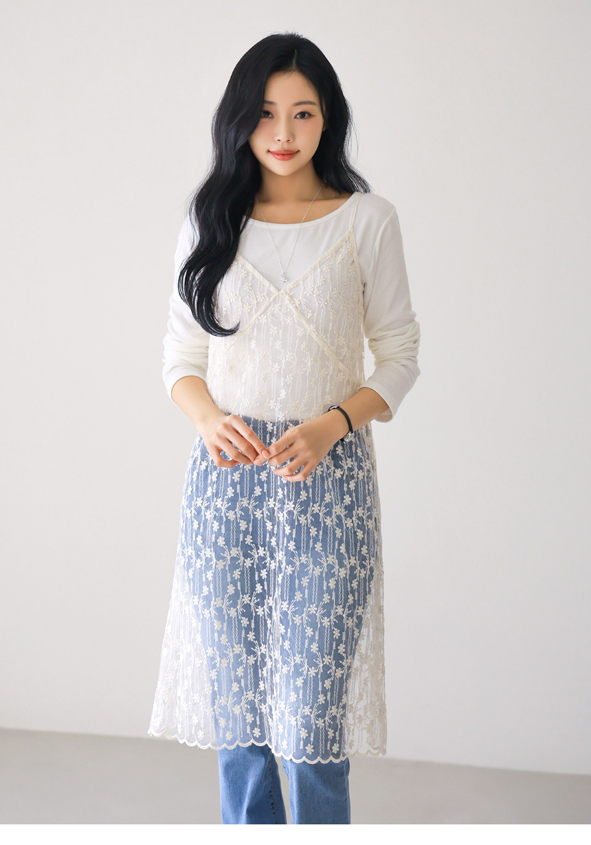 [A delicate sheer lace bustier dress designed for effortless layering, featuring fine floral embroidery, adjustable straps, and a light silhouette that elevates simple tops with feminine, trendy appeal.]