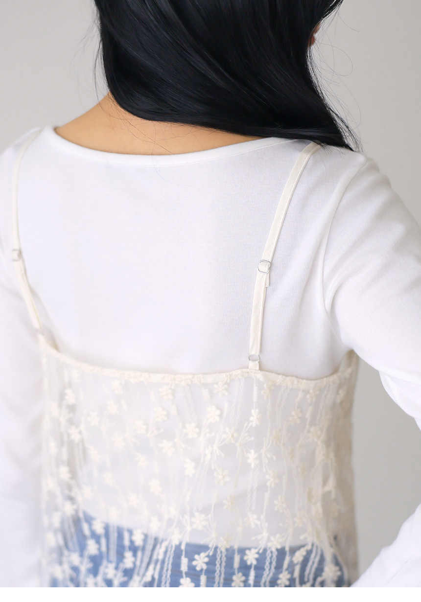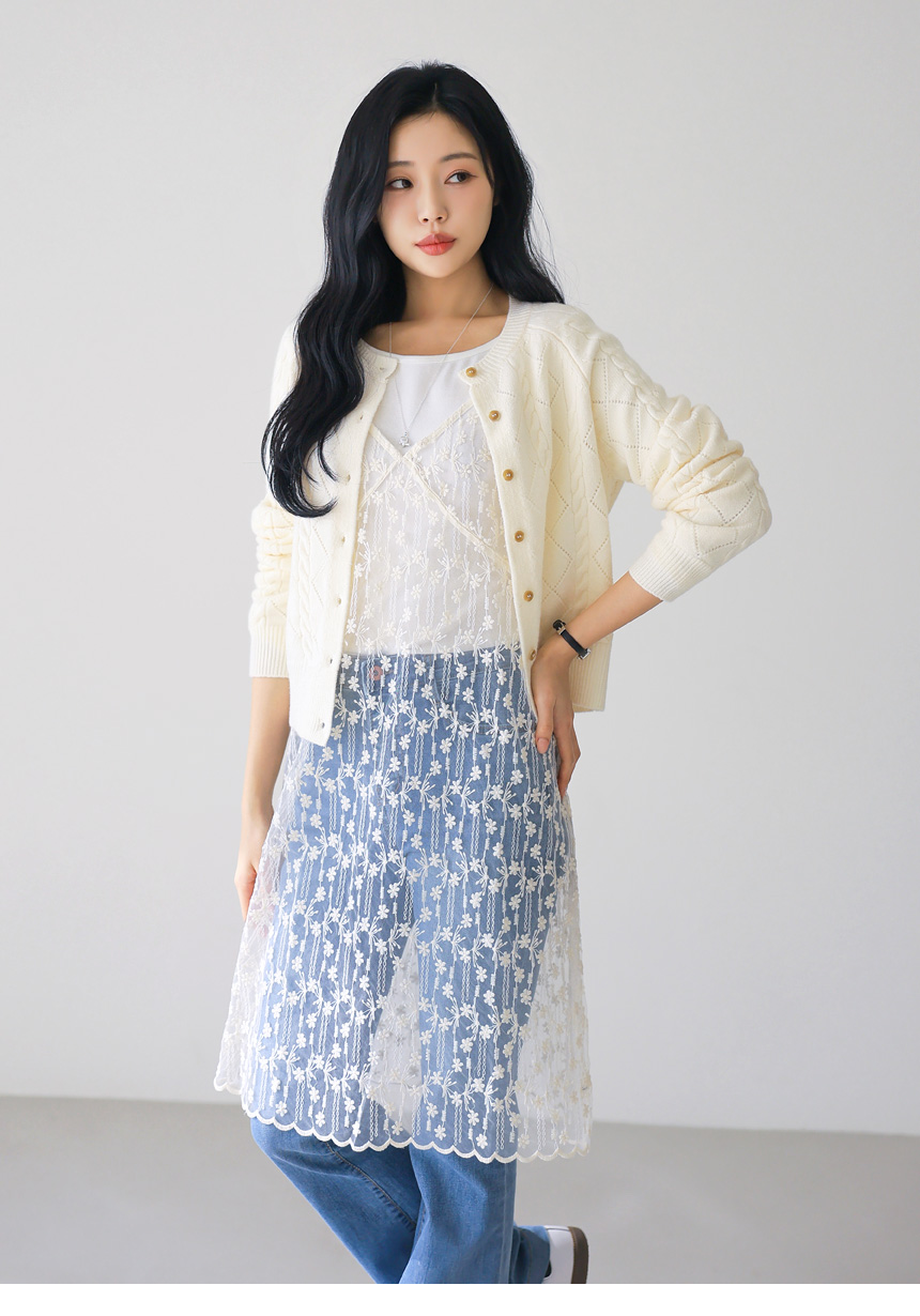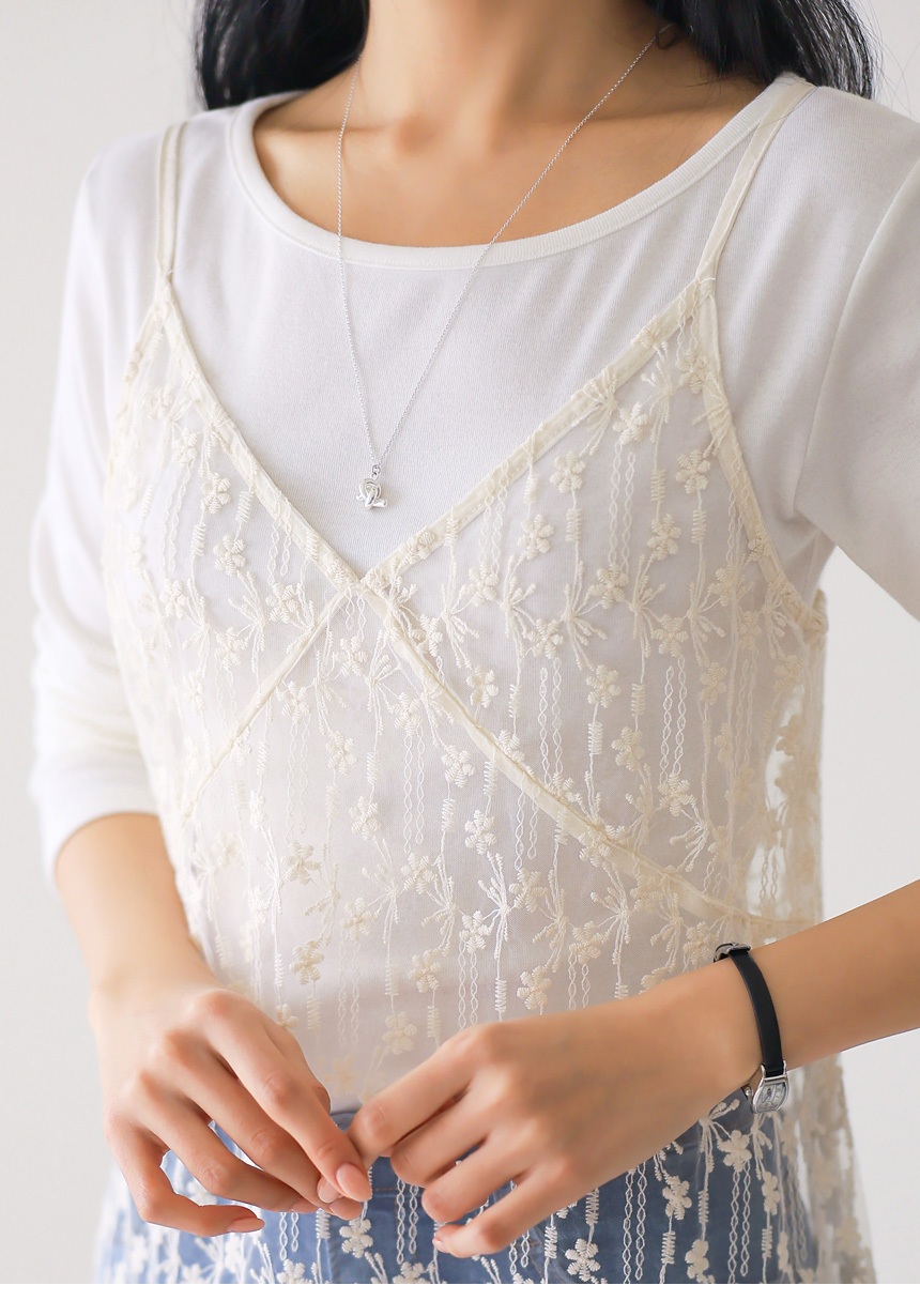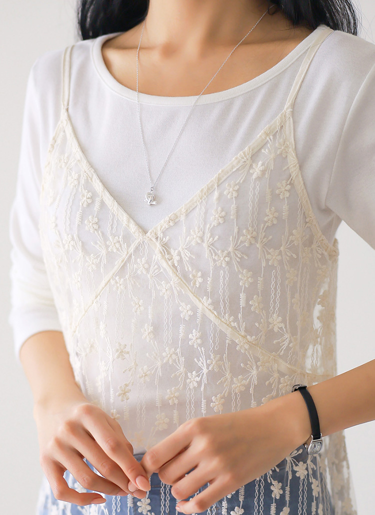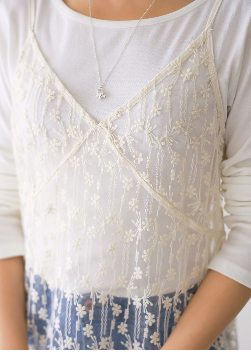 [A delicate sheer lace bustier dress designed for effortless layering, featuring fine floral embroidery, adjustable straps, and a light silhouette that elevates simple tops with feminine, trendy appeal.]