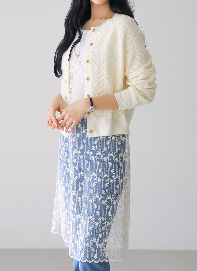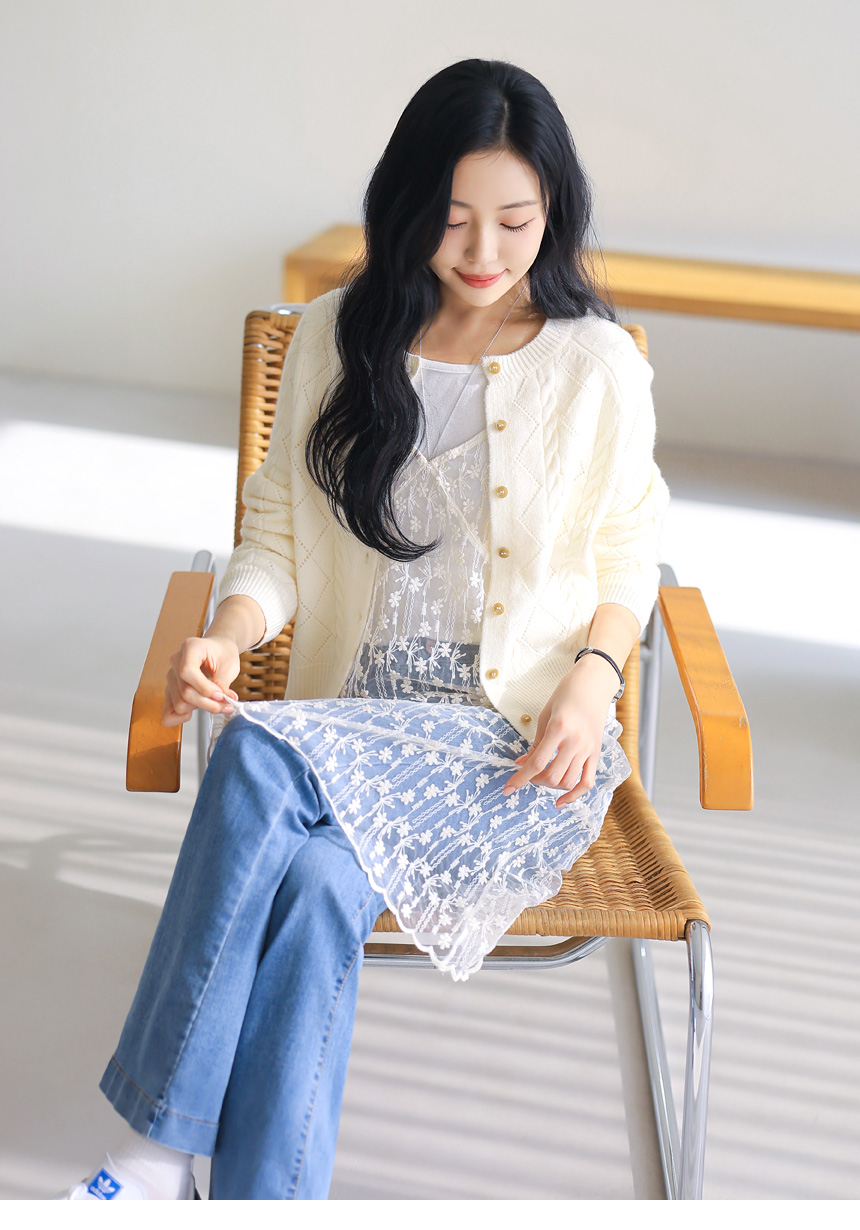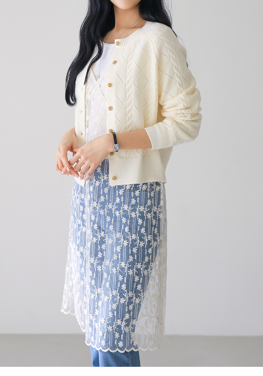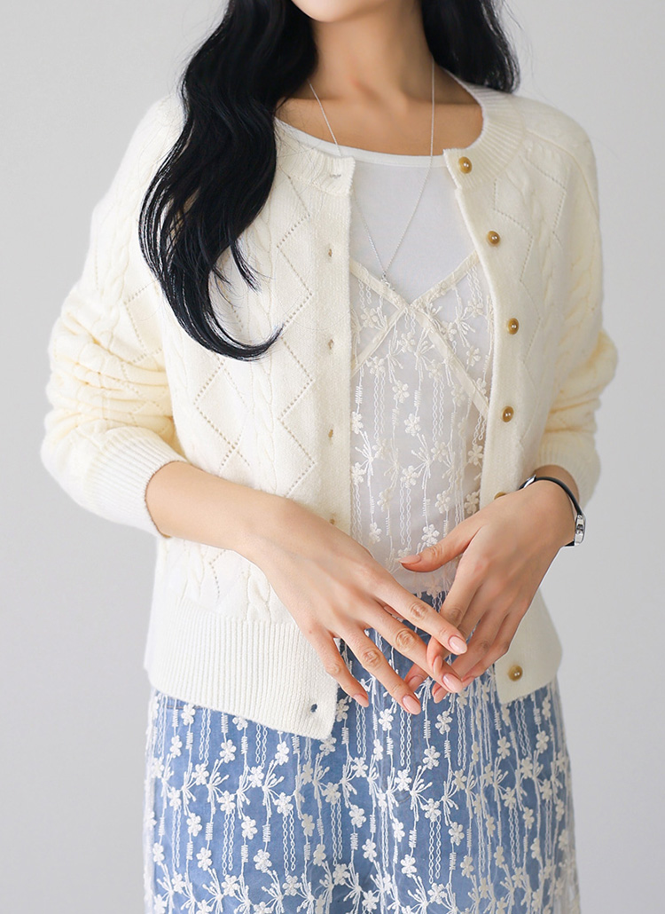 • A cozy cardigan blending cable texture with argyle punch patterns, finished in a semi-cropped fit that flatters the frame while offering soft warmth and daily versatility.