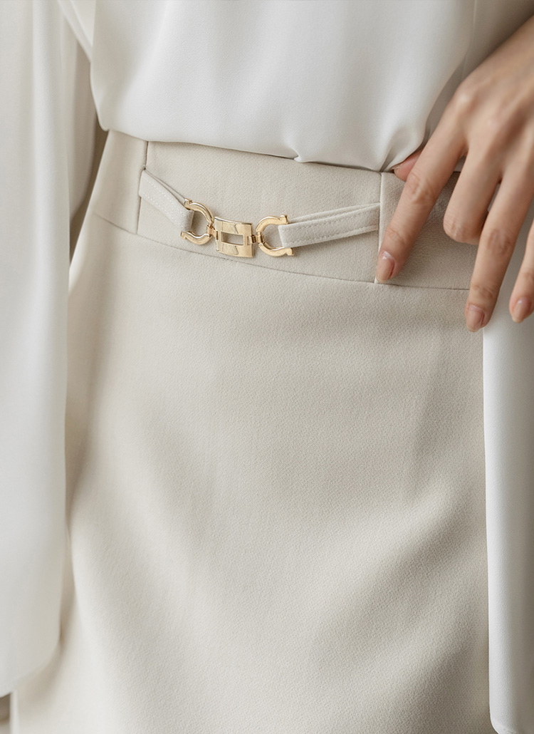[This refined H-line midi skirt features a subtle chain accent at the waist and a clean straight silhouette, offering gentle stretch comfort and a polished look for office and formal wear.]