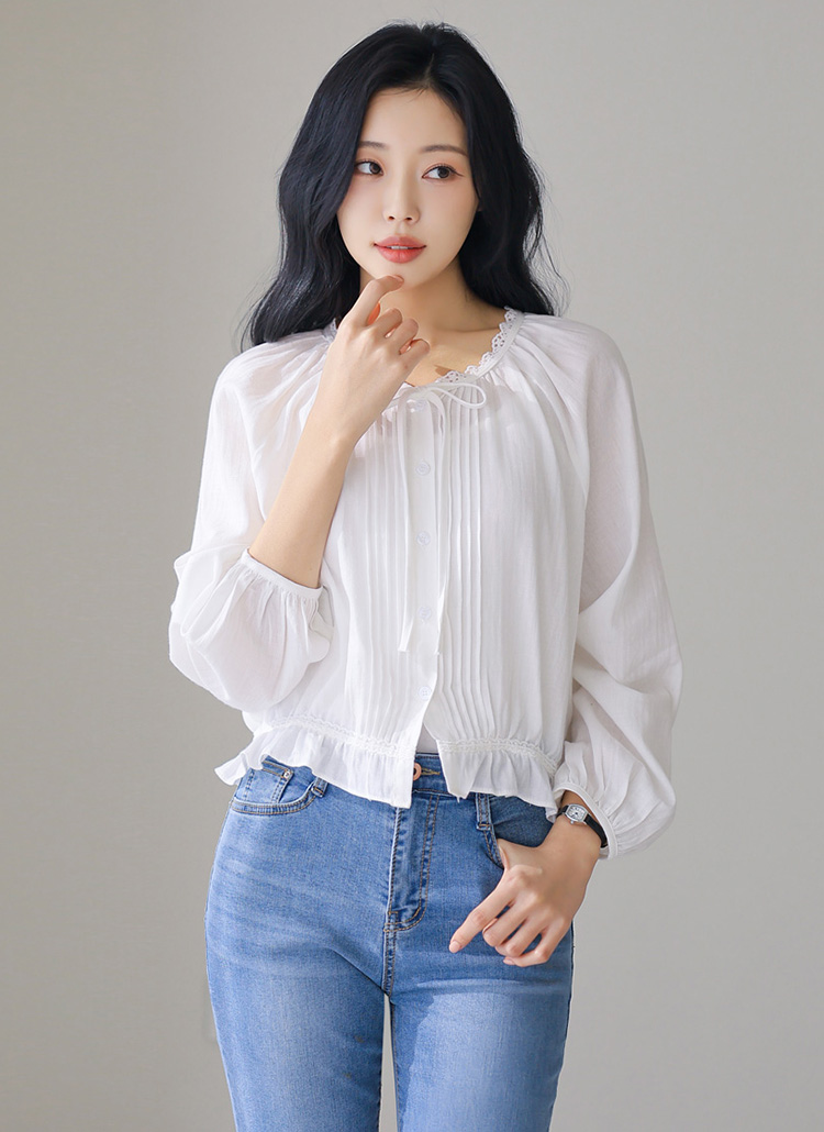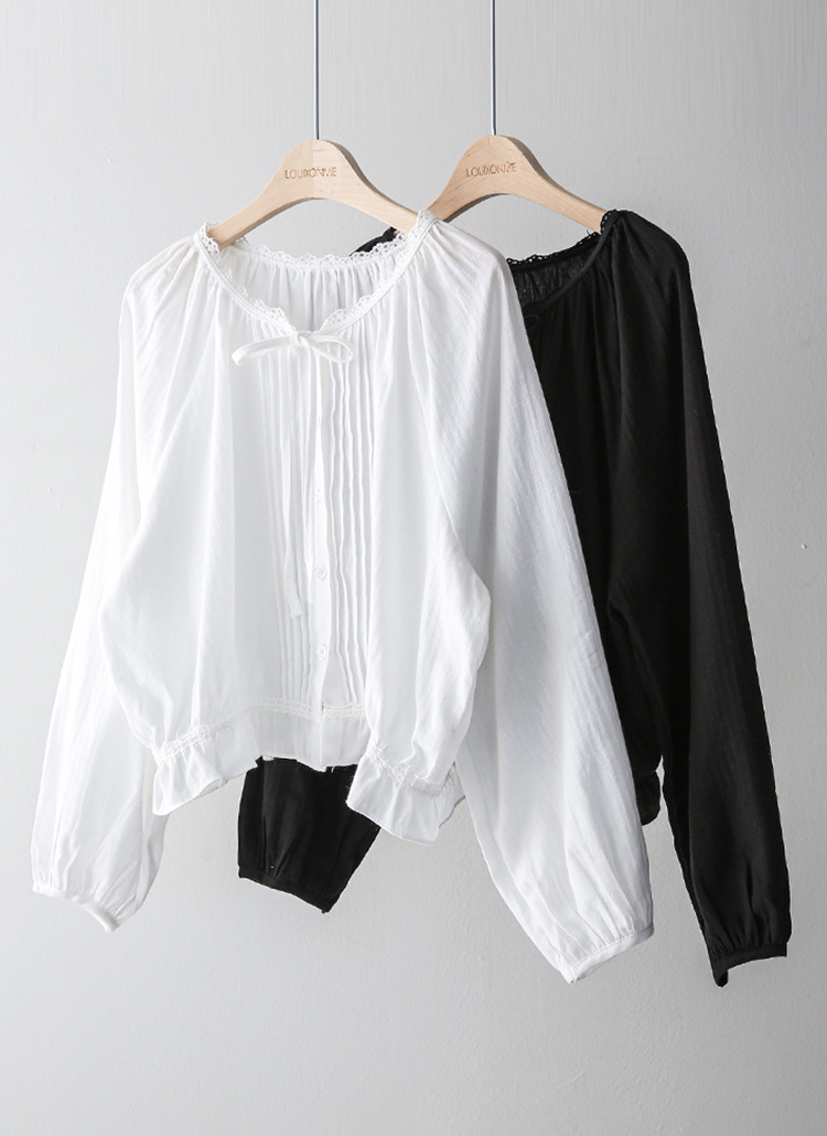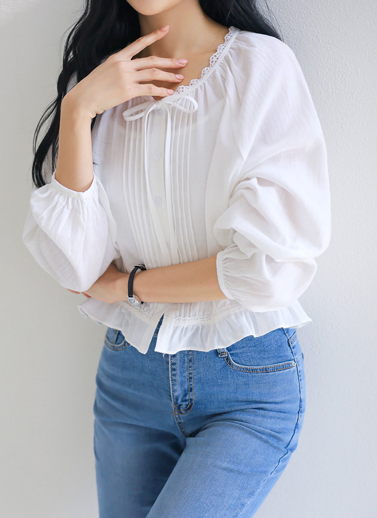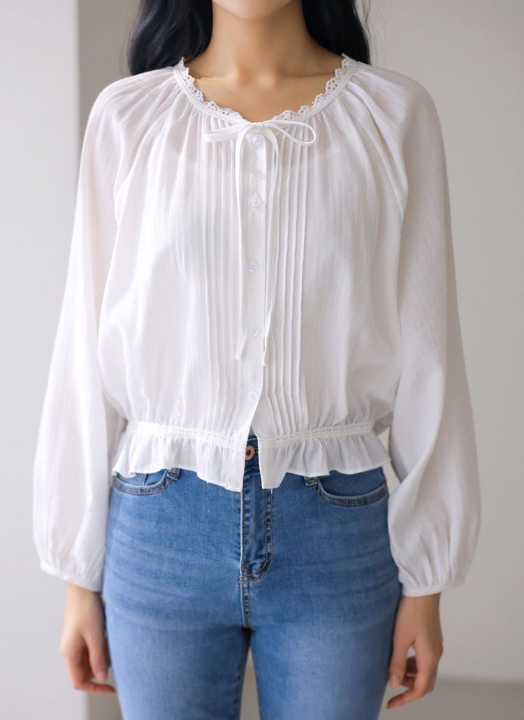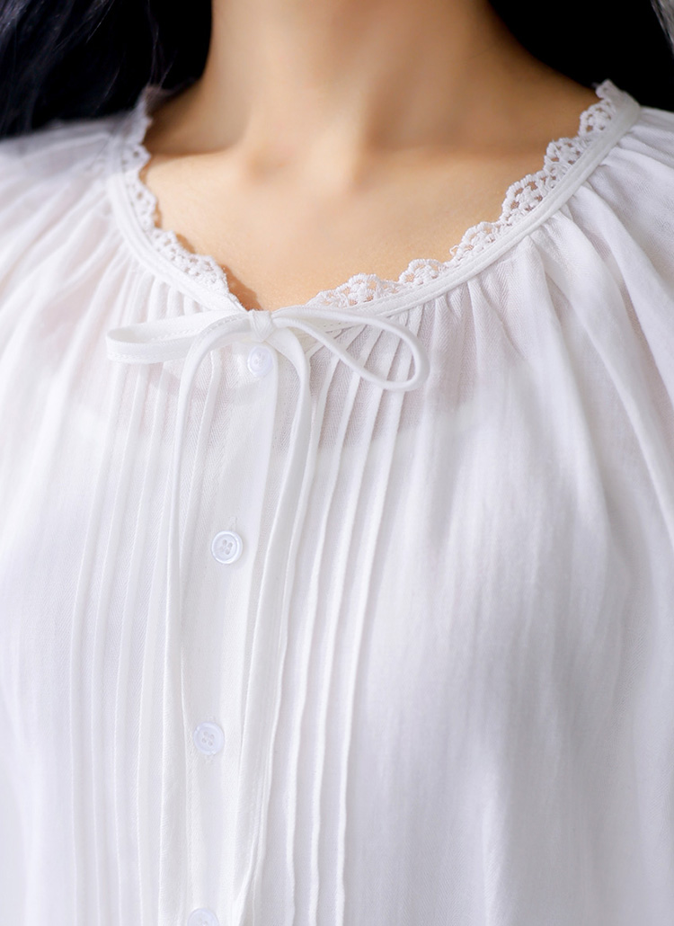 [This airy cotton blouse features a lace-trim neckline, subtle ribbon tie, and vertical pintucks, creating a feminine silhouette that feels light, elegant, and easy to wear all day.]