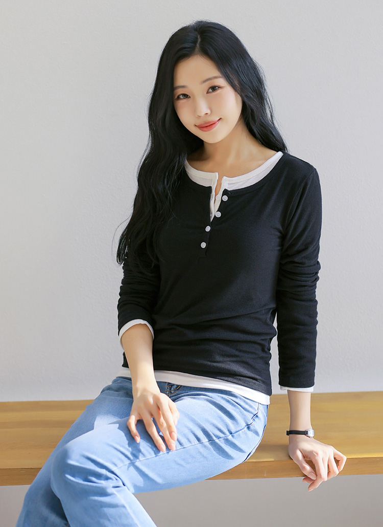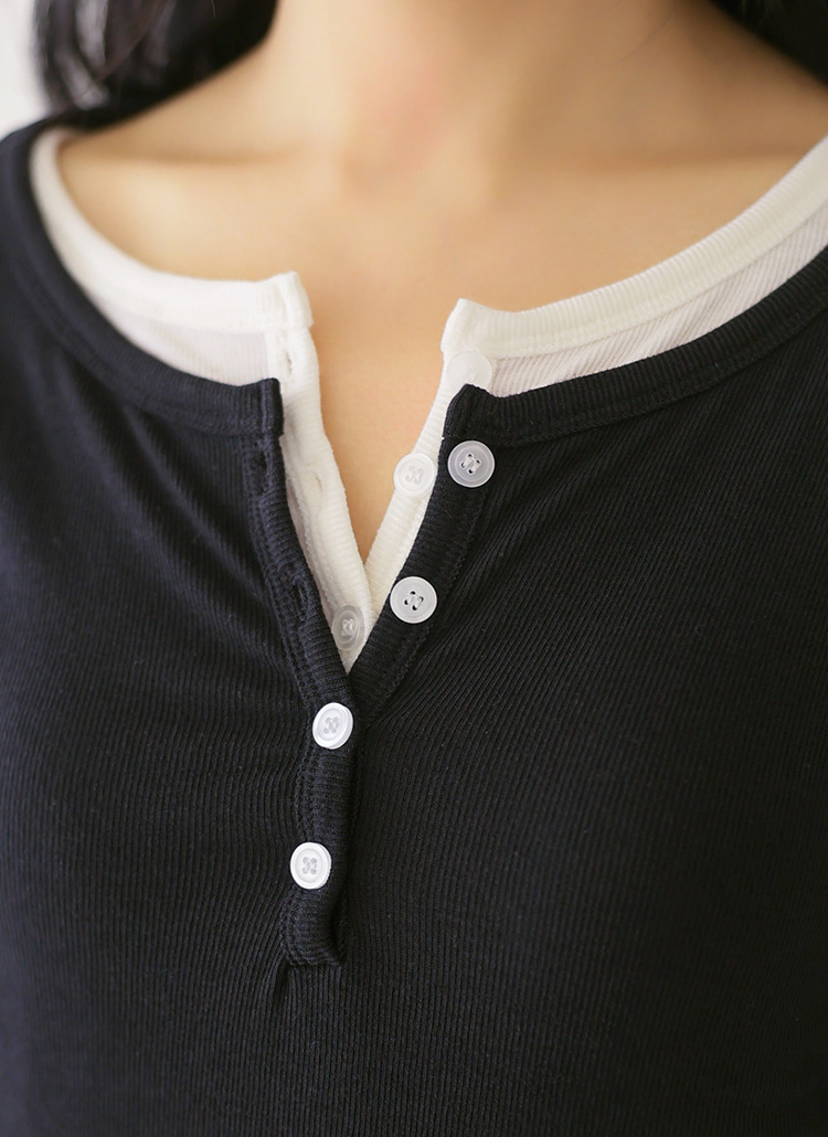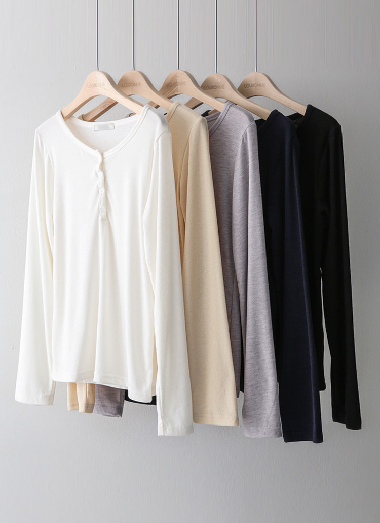 [A minimal button-neck top with a sleek slim silhouette and soft stretch texture, perfect for wearing solo or layered in contrasting tones for effortless styling.]