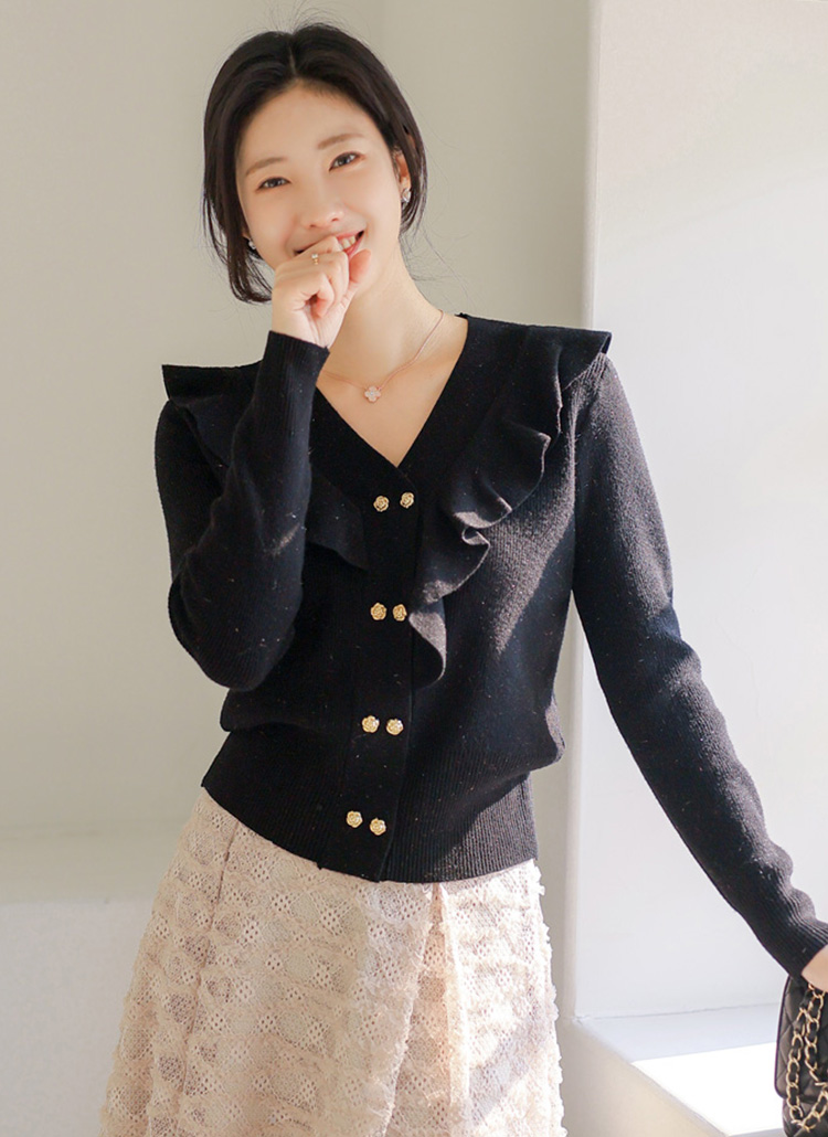 [Designed with graceful ruffles along the V-neck and rose-inspired gold buttons. Stretchy rib knit offers comfort while enhancing curves with a refined, luminous finish.]